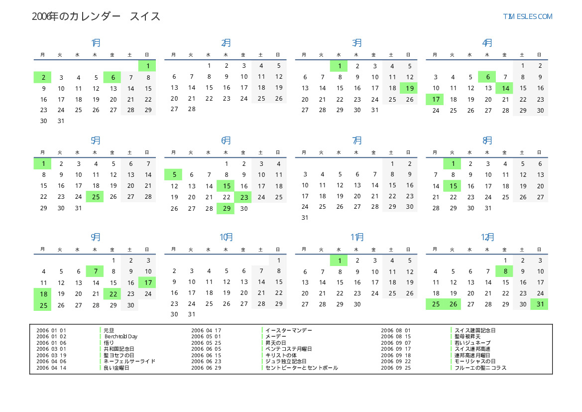 スイス向け2006年の休日と週末を含むPDFカレンダーをダウンロードして印刷します