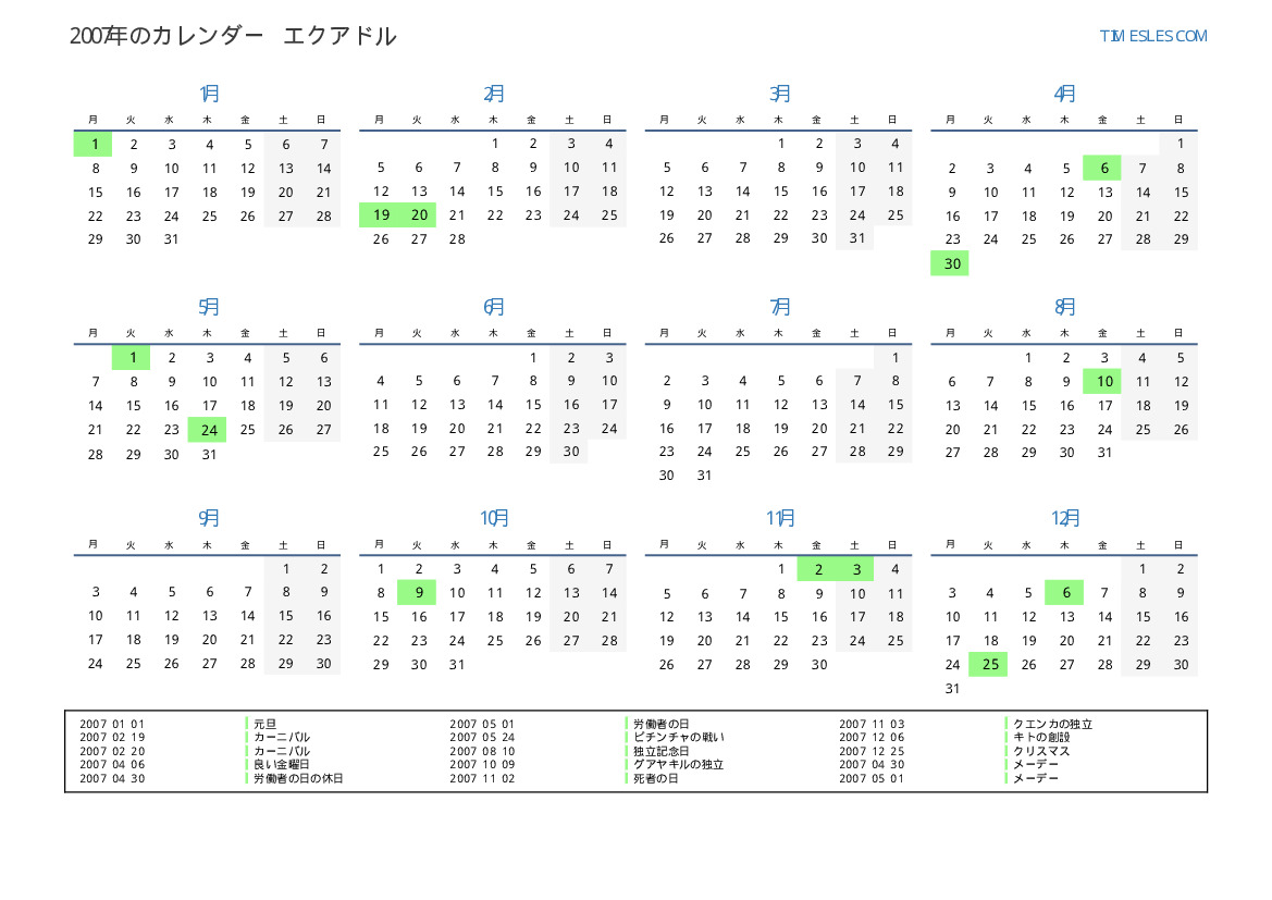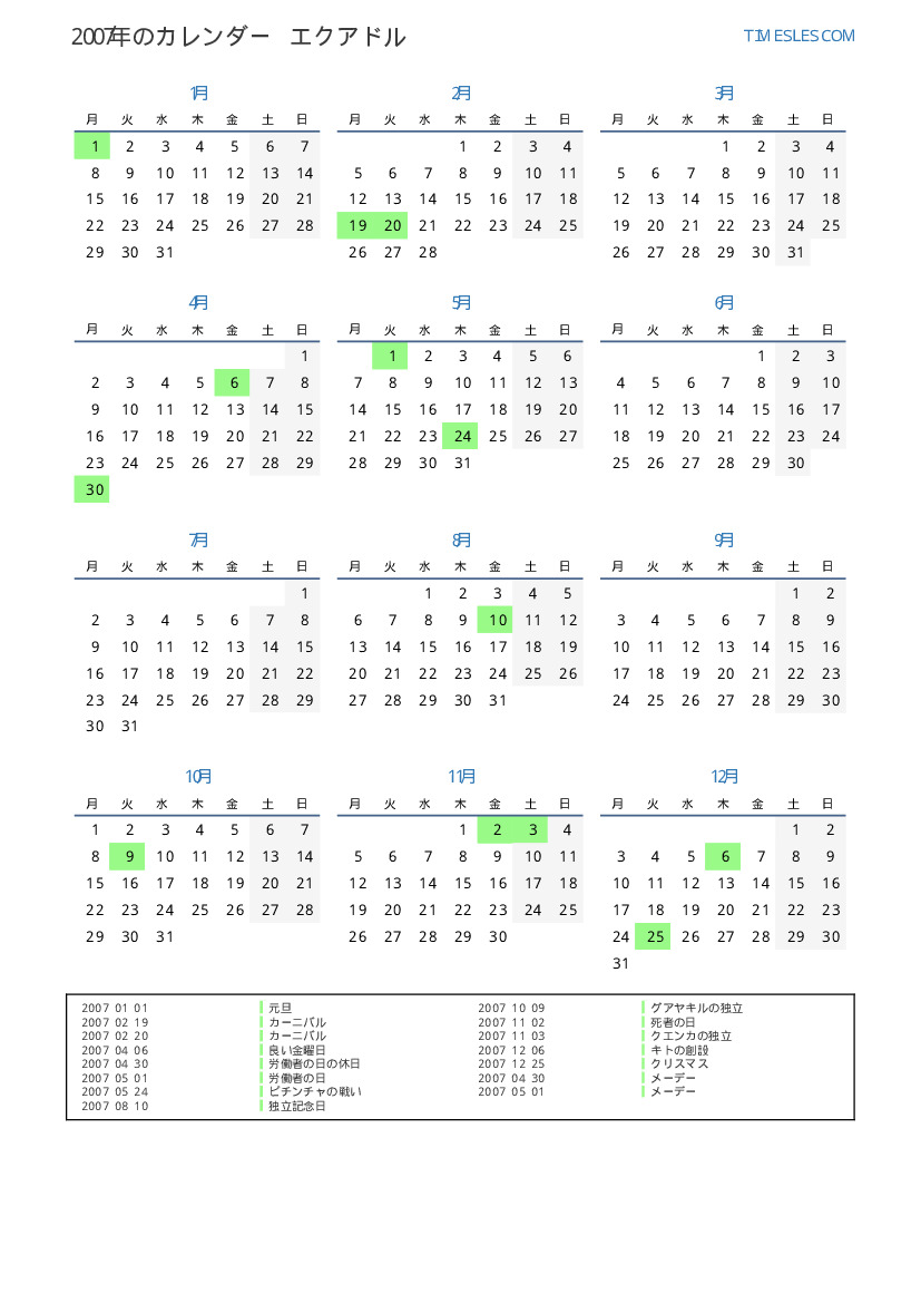 エクアドル向けの2007年の休日と週末のカレンダー