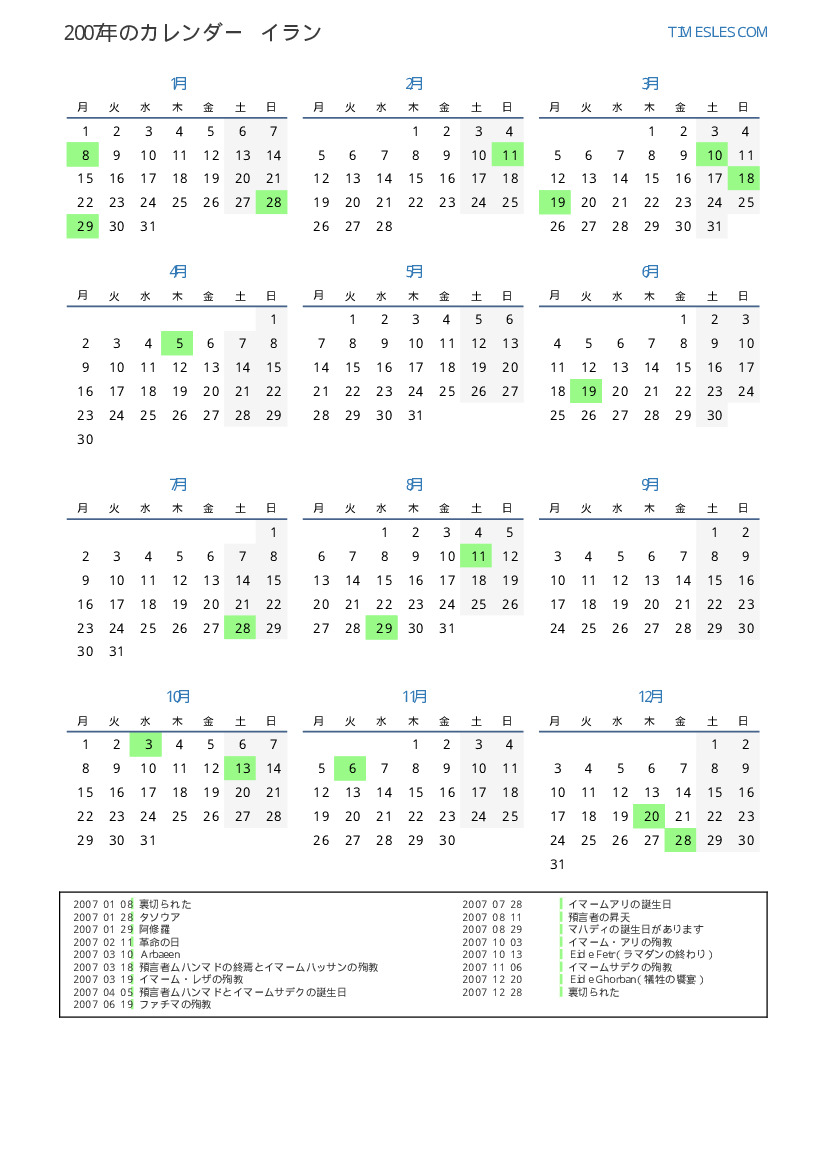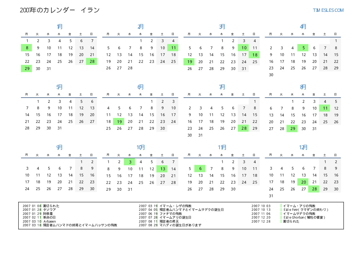 イランのためにの2007年の休日と週末のカレンダー