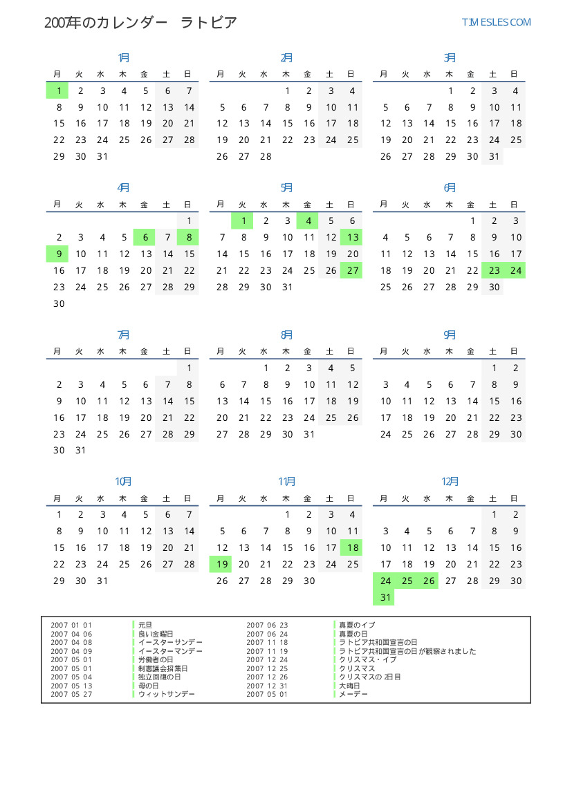 ラトビア向け2007年の休日と週末を含むPDFカレンダーをダウンロードして印刷します