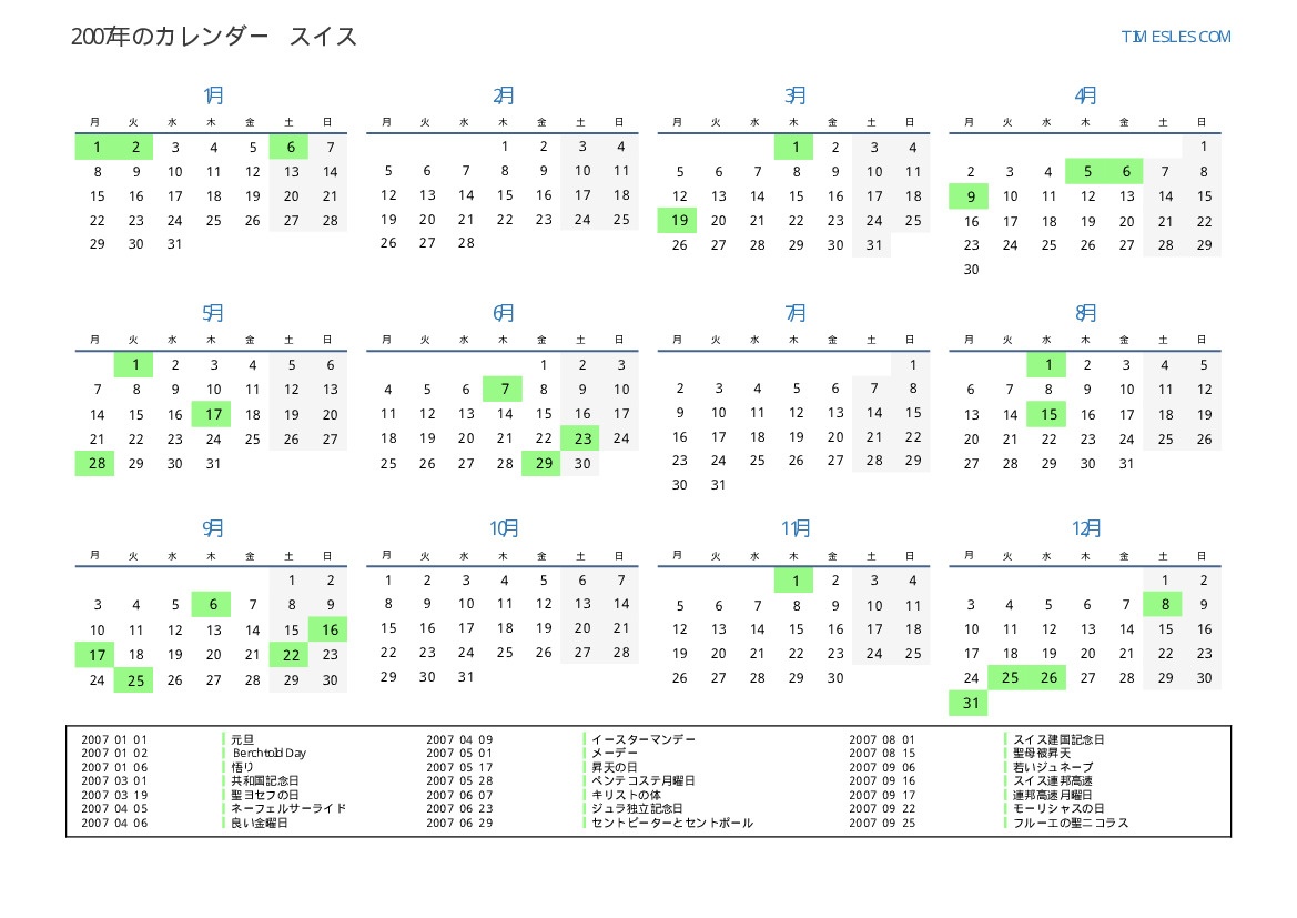 スイス向け2007年の休日と週末を含むPDFカレンダーをダウンロードして印刷します