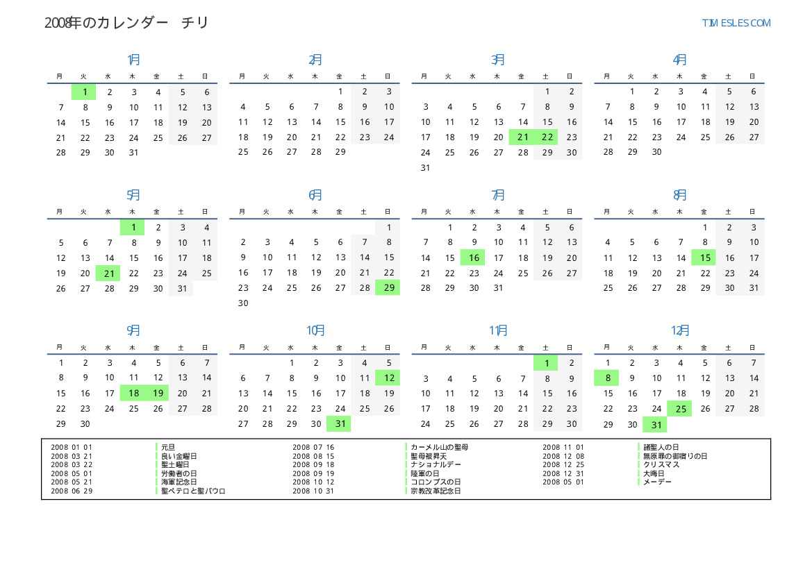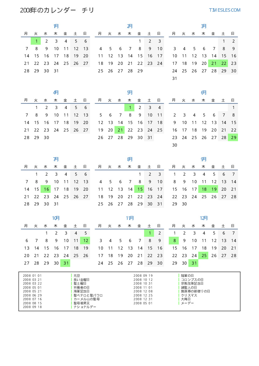 チリ向け2008年の休日と週末を含むPDFカレンダーをダウンロードして印刷します