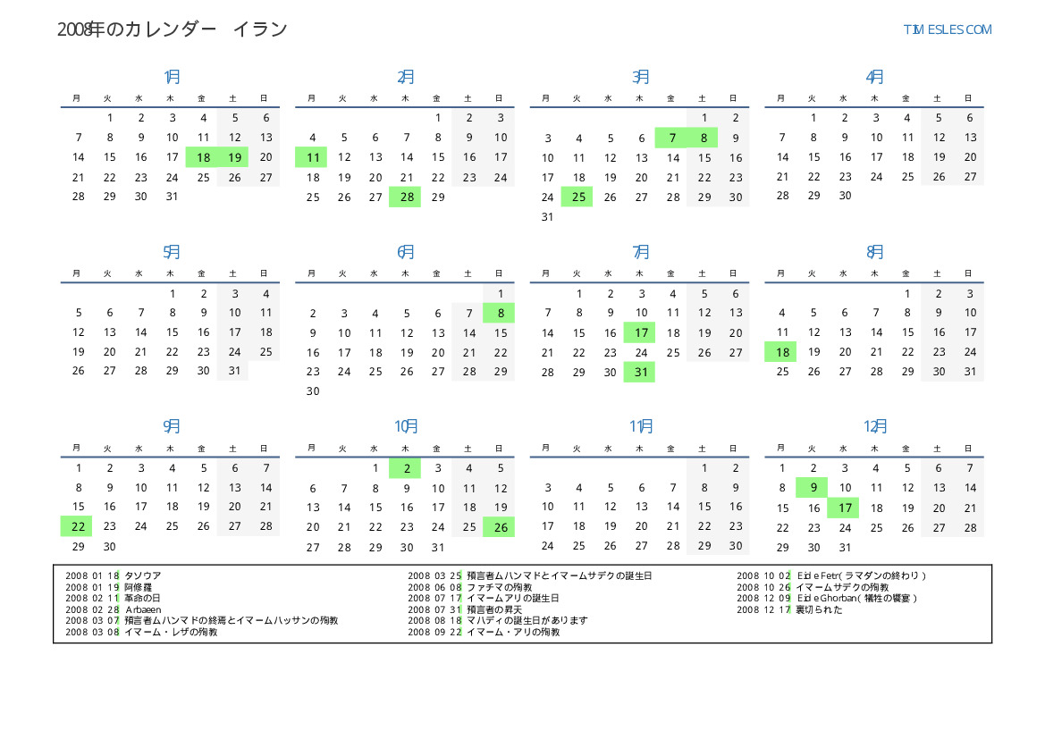 イランのために2008年の休日と週末を含むPDFカレンダーをダウンロードして印刷します