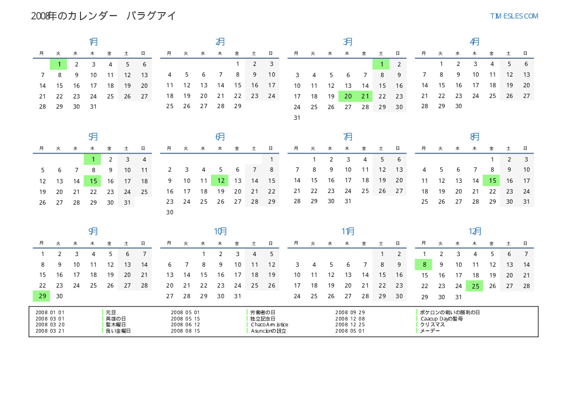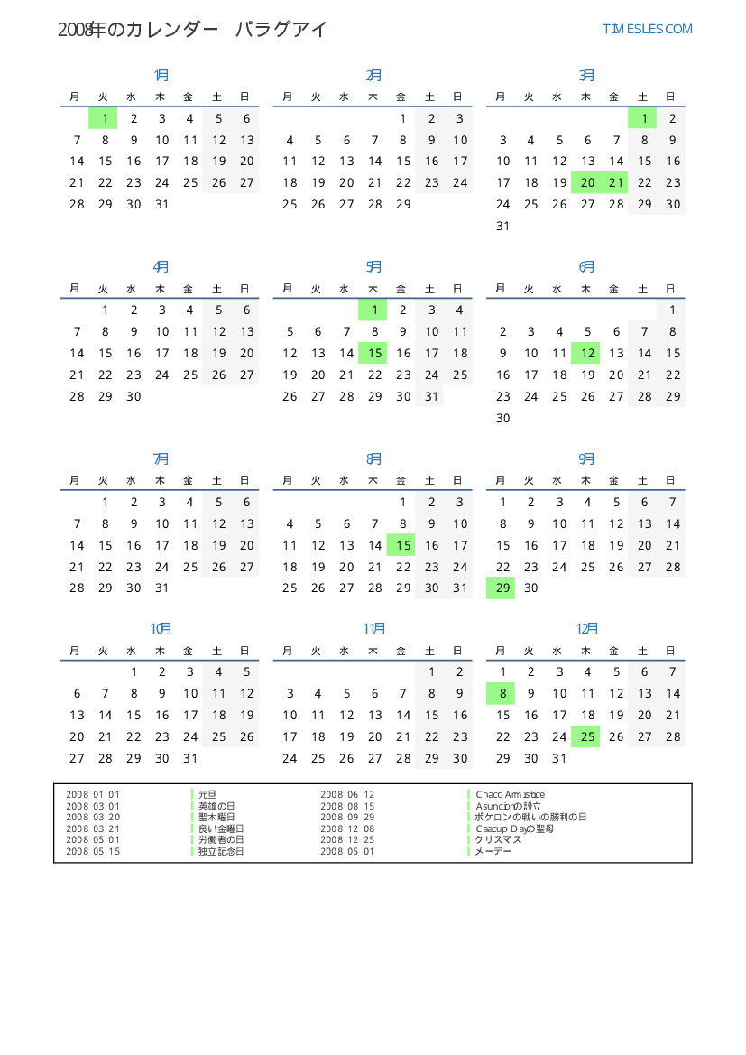 パラグアイ向けの2008年の休日と週末のカレンダー