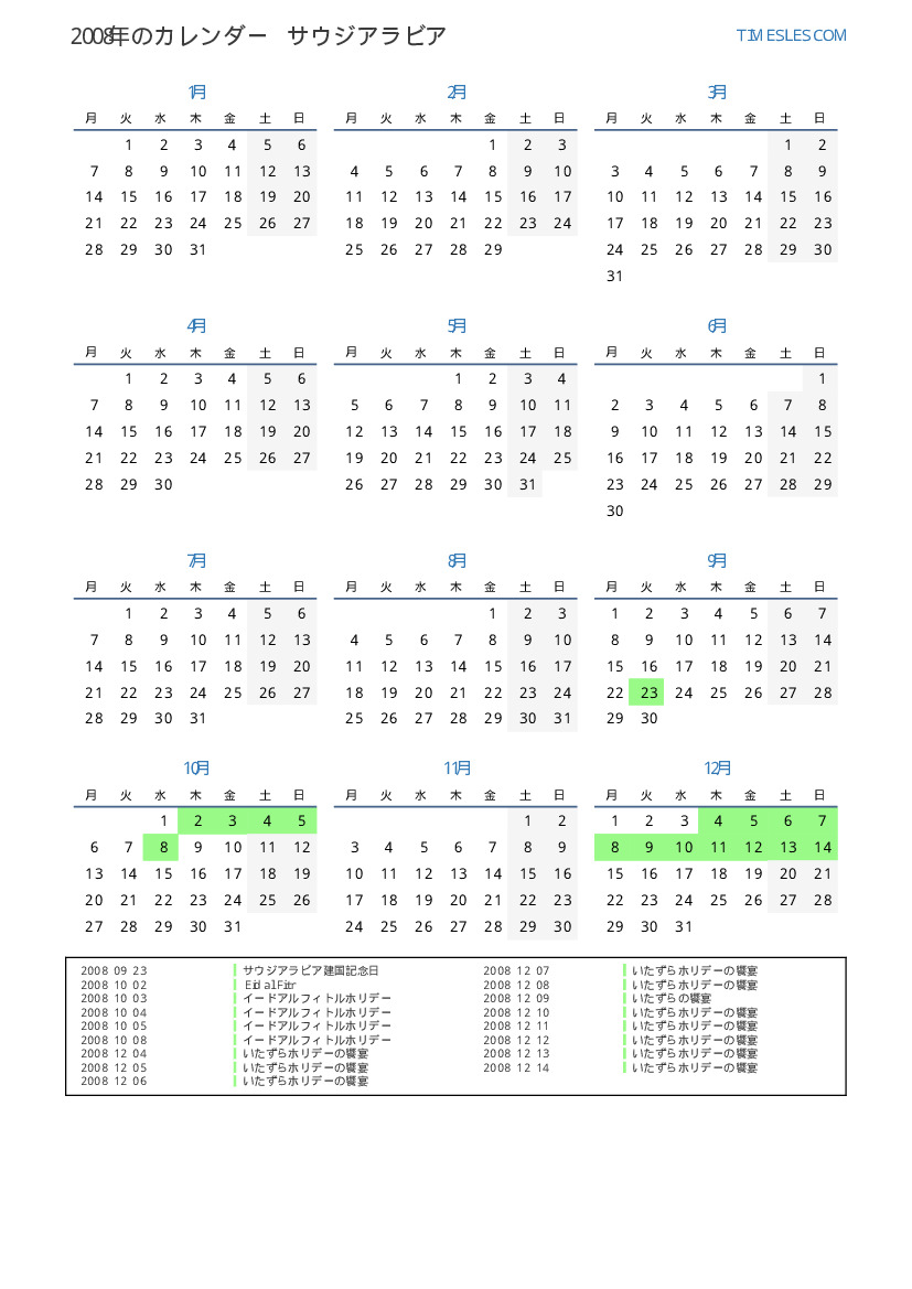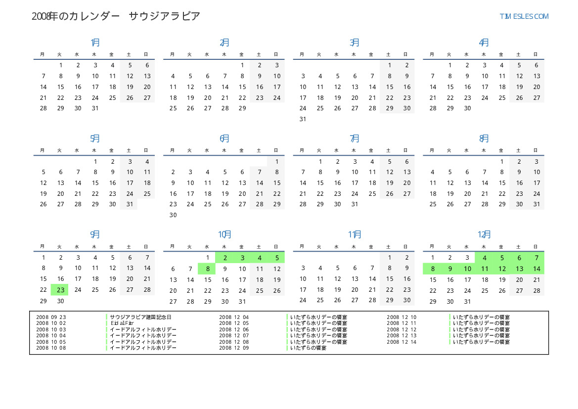 サウジアラビア向けの2008年の休日と週末のカレンダー