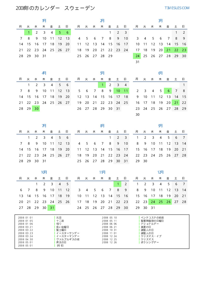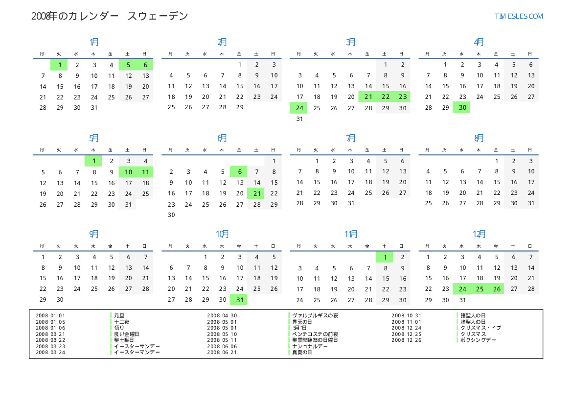 スウェーデン向けの2008年の休日と週末のカレンダー