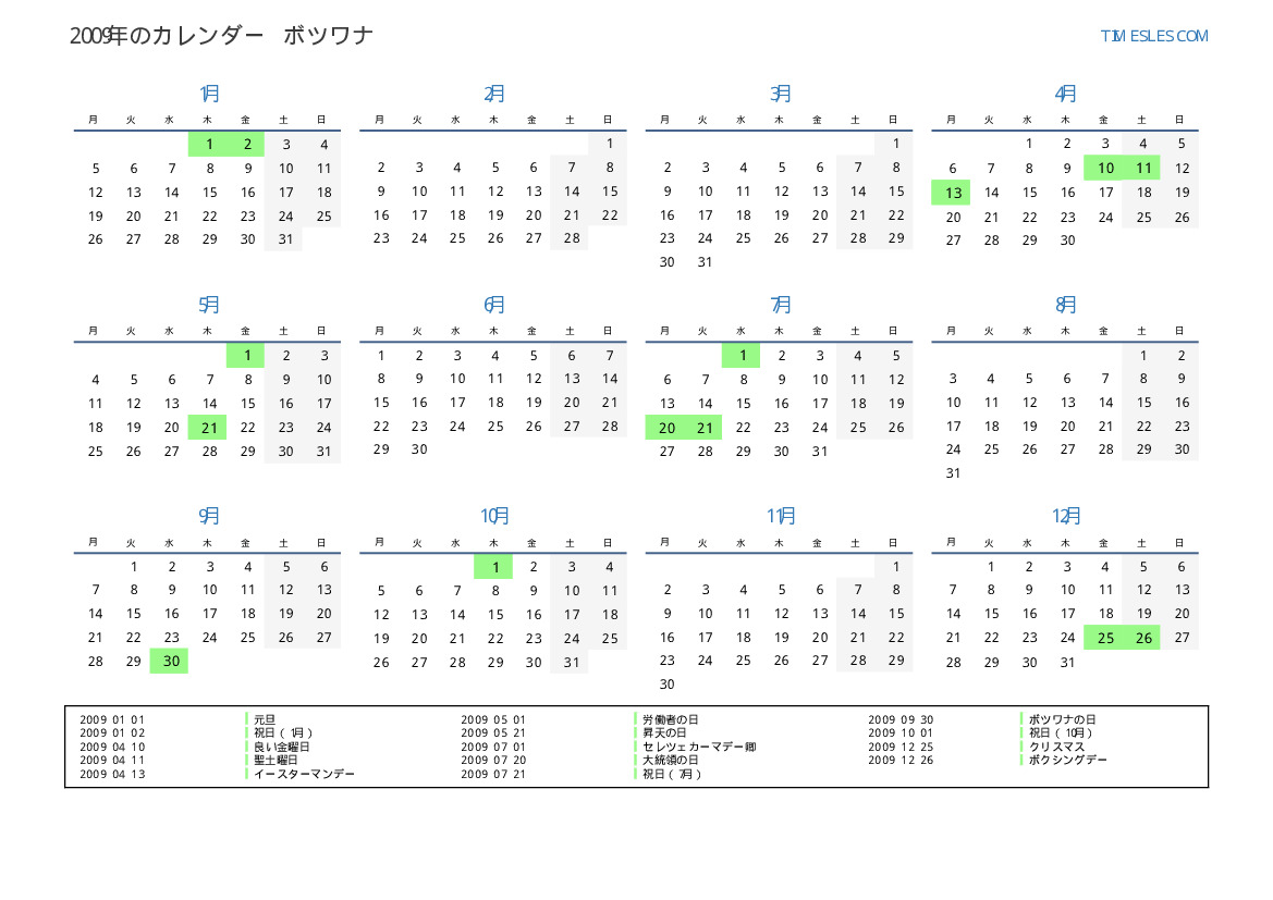 ボツワナ向けの2009年の休日と週末のカレンダー