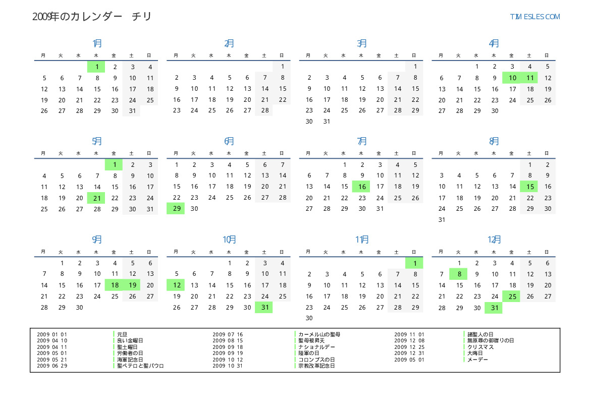 チリ向け2009年の休日と週末を含むPDFカレンダーをダウンロードして印刷します