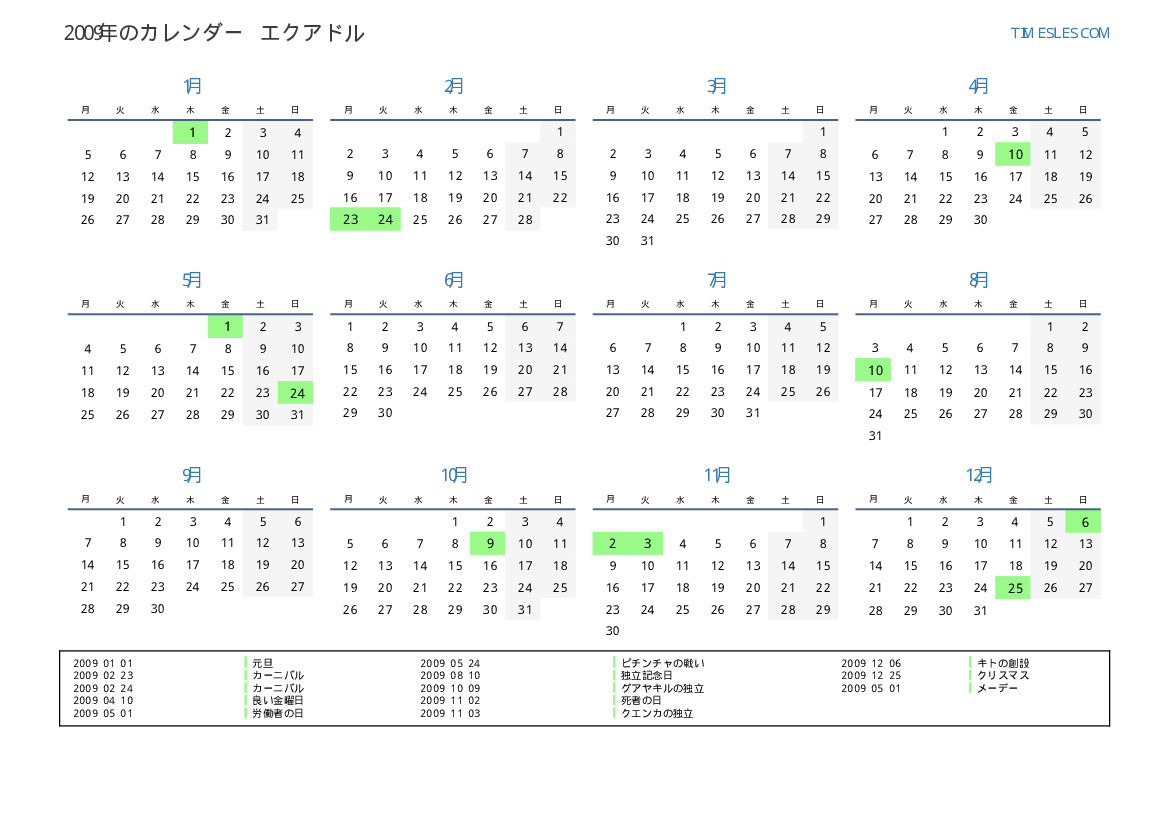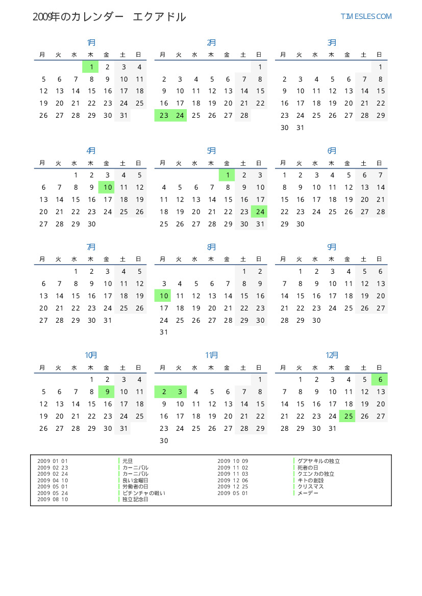 エクアドル向け2009年の休日と週末を含むPDFカレンダーをダウンロードして印刷します