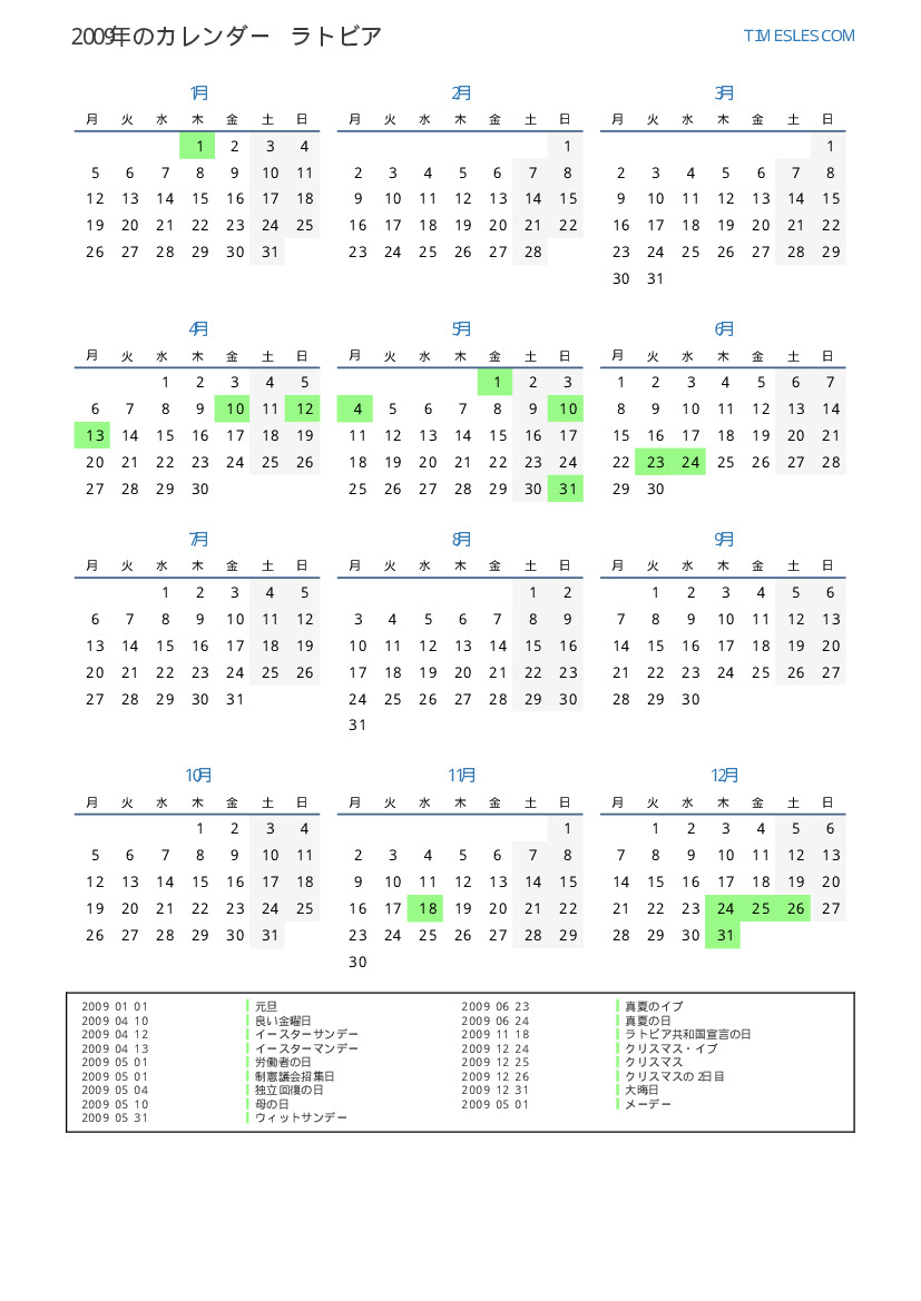 ラトビア向け2009年の休日と週末を含むPDFカレンダーをダウンロードして印刷します