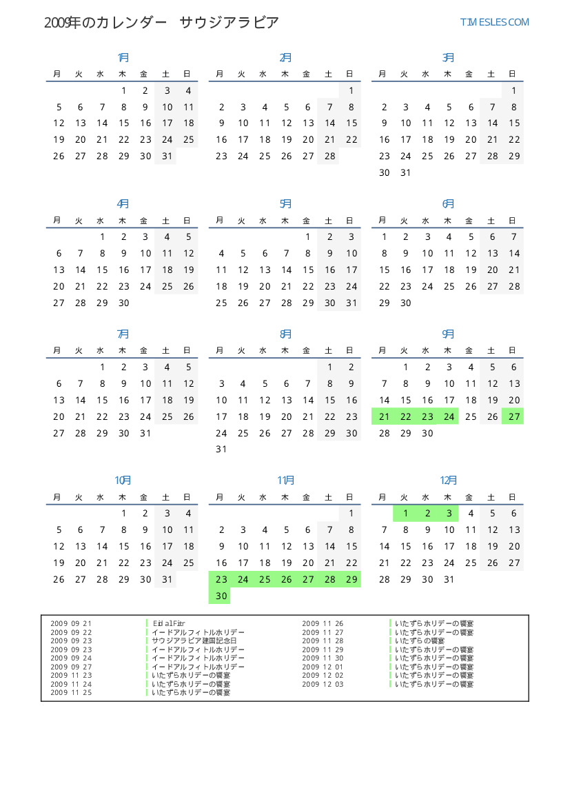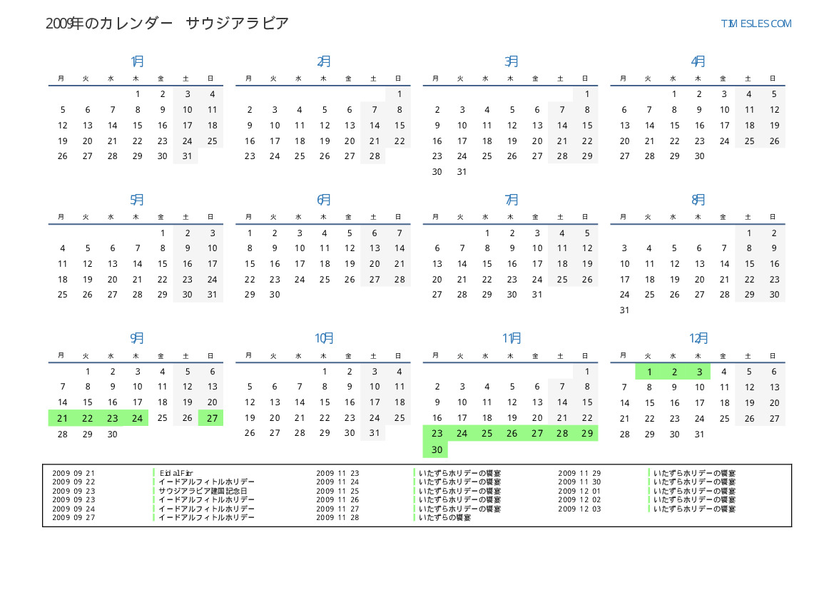 サウジアラビア向けの2009年の休日と週末のカレンダー