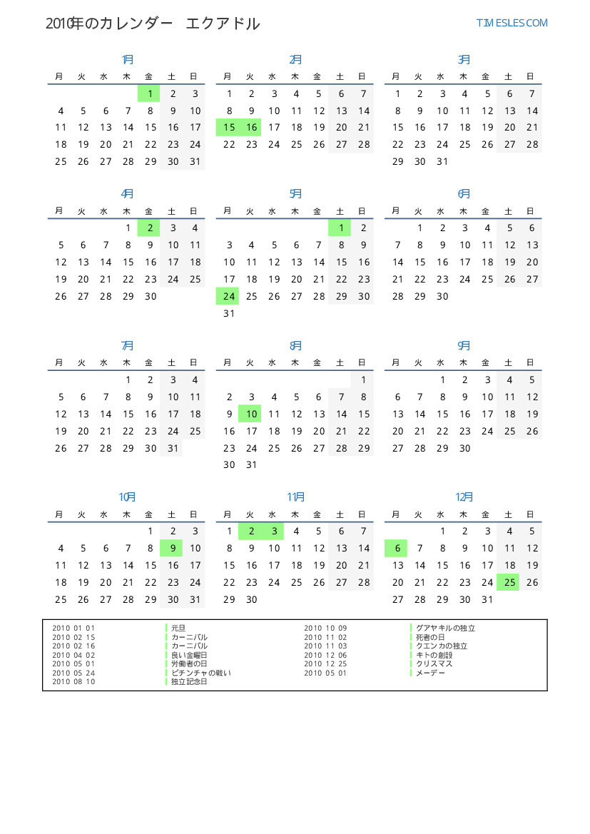 エクアドル向け2010年の休日と週末を含むPDFカレンダーをダウンロードして印刷します
