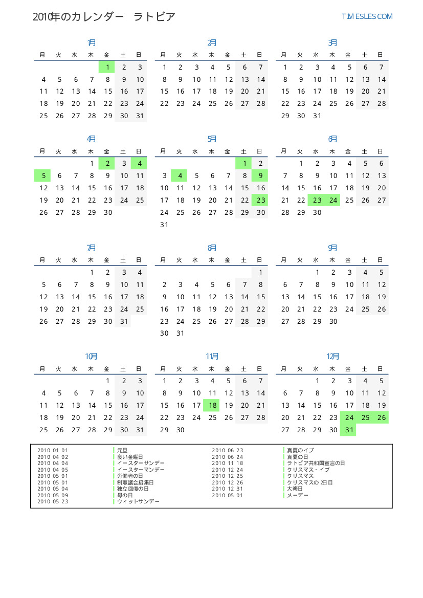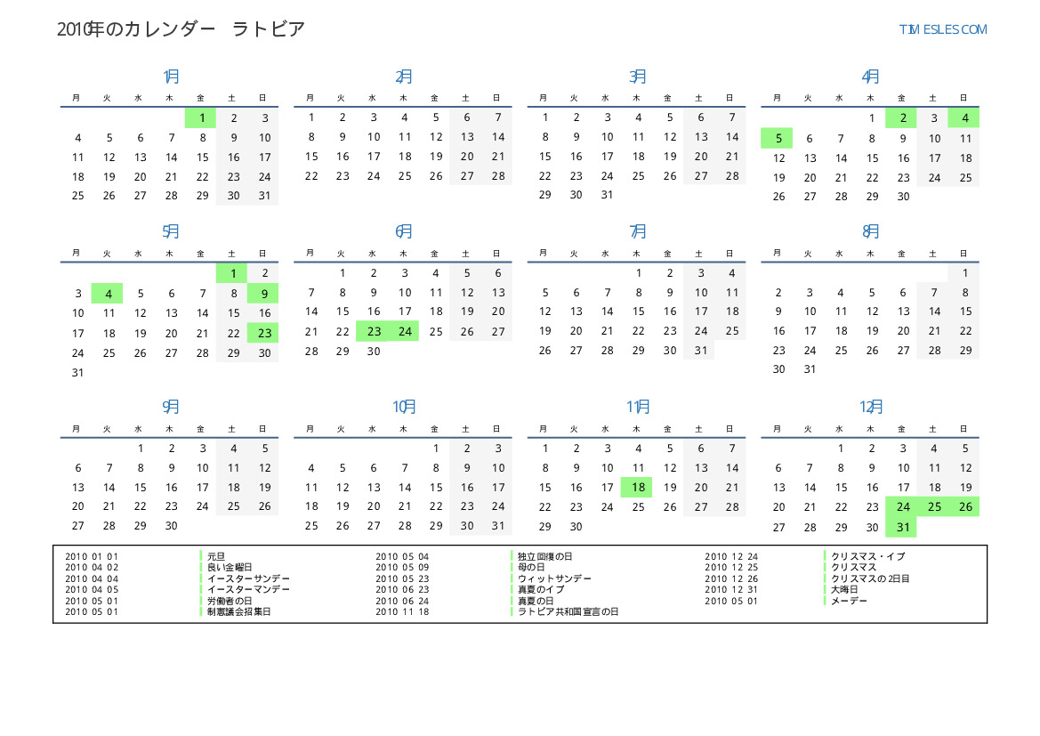 ラトビア向けの2010年の休日と週末のカレンダー