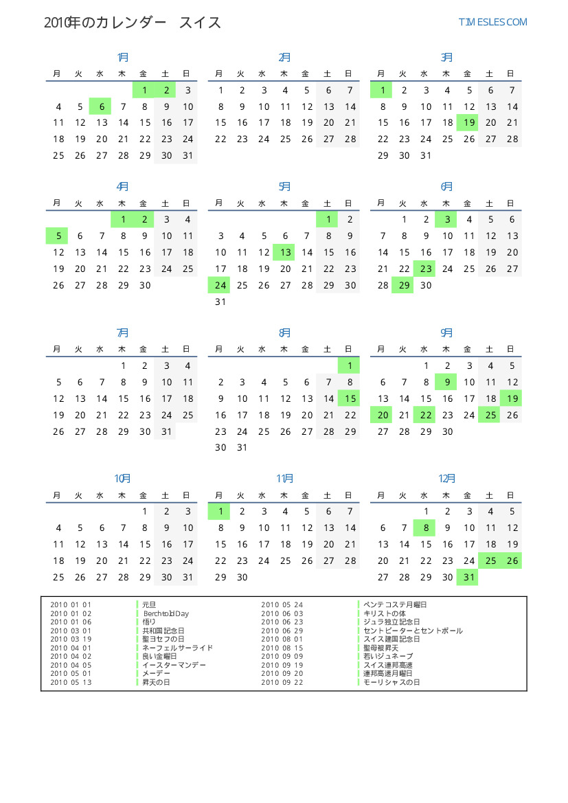 スイス向けの2010年の休日と週末のカレンダー