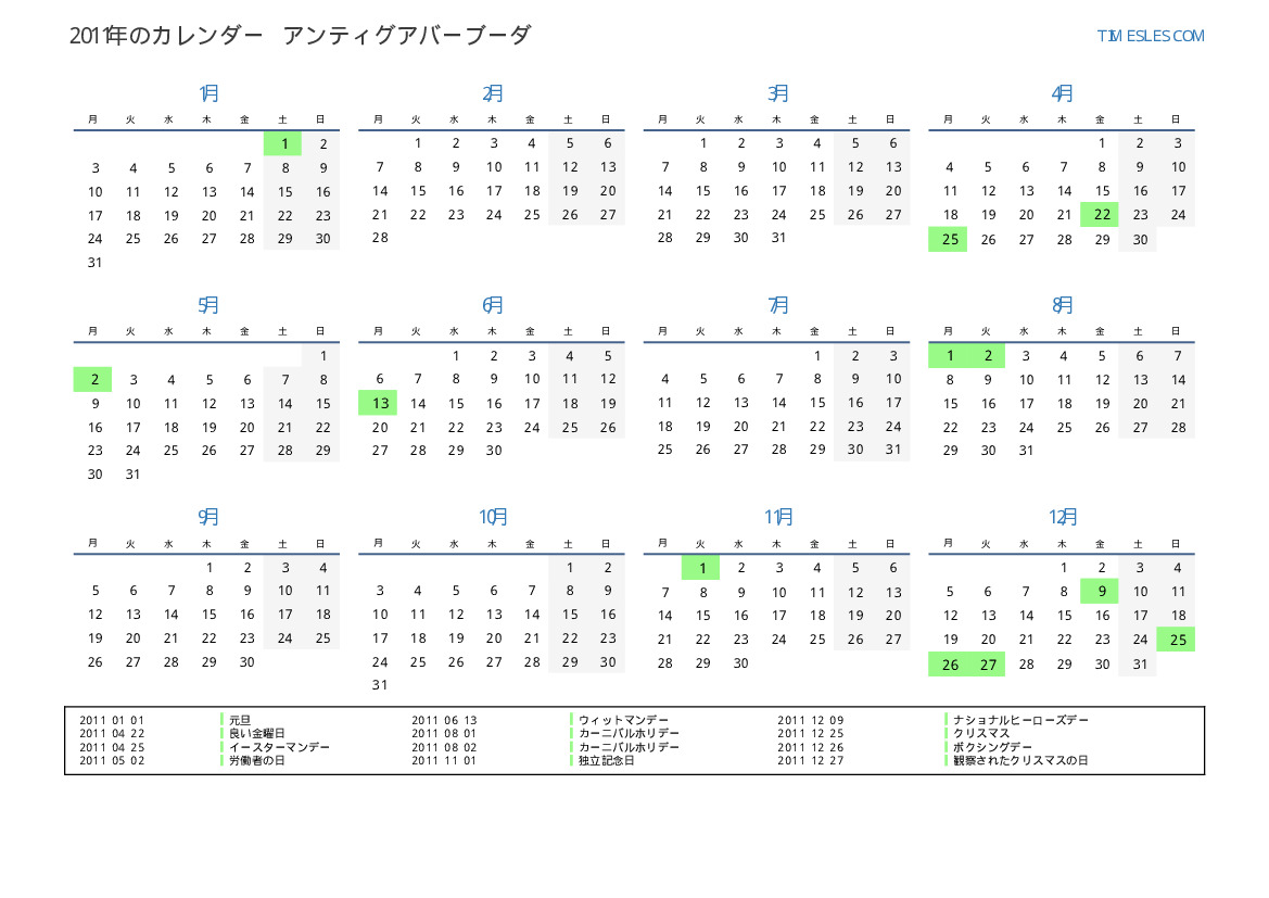 アンティグアバーブーダ2011年の休日と週末を含むPDFカレンダーをダウンロードして印刷します