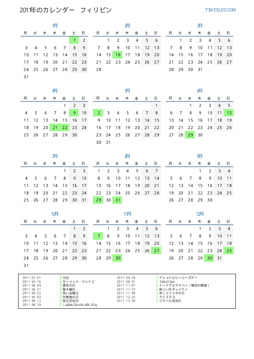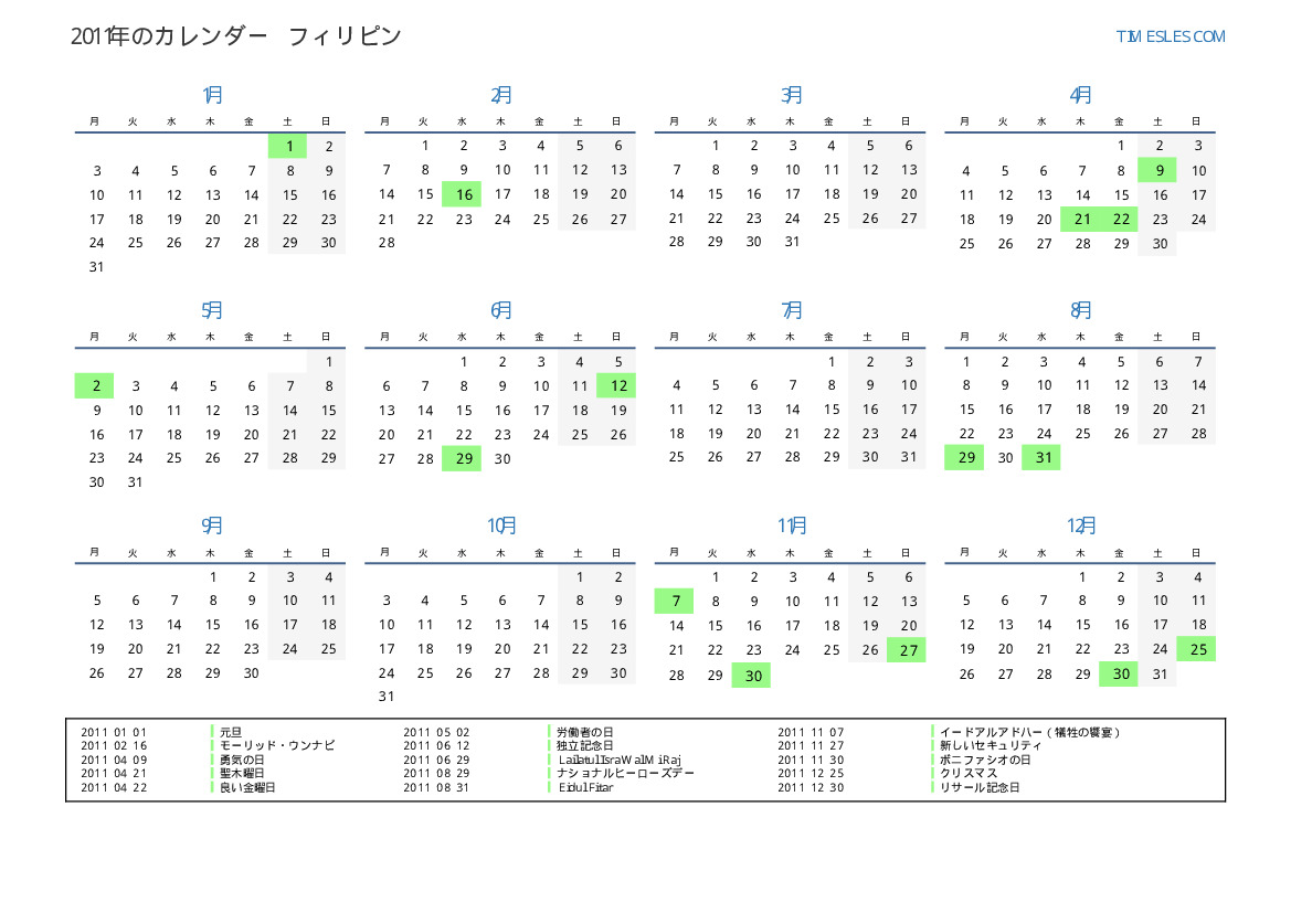 フィリピン向けの2011年の休日と週末のカレンダー