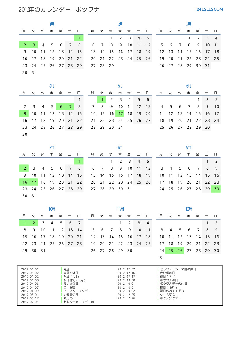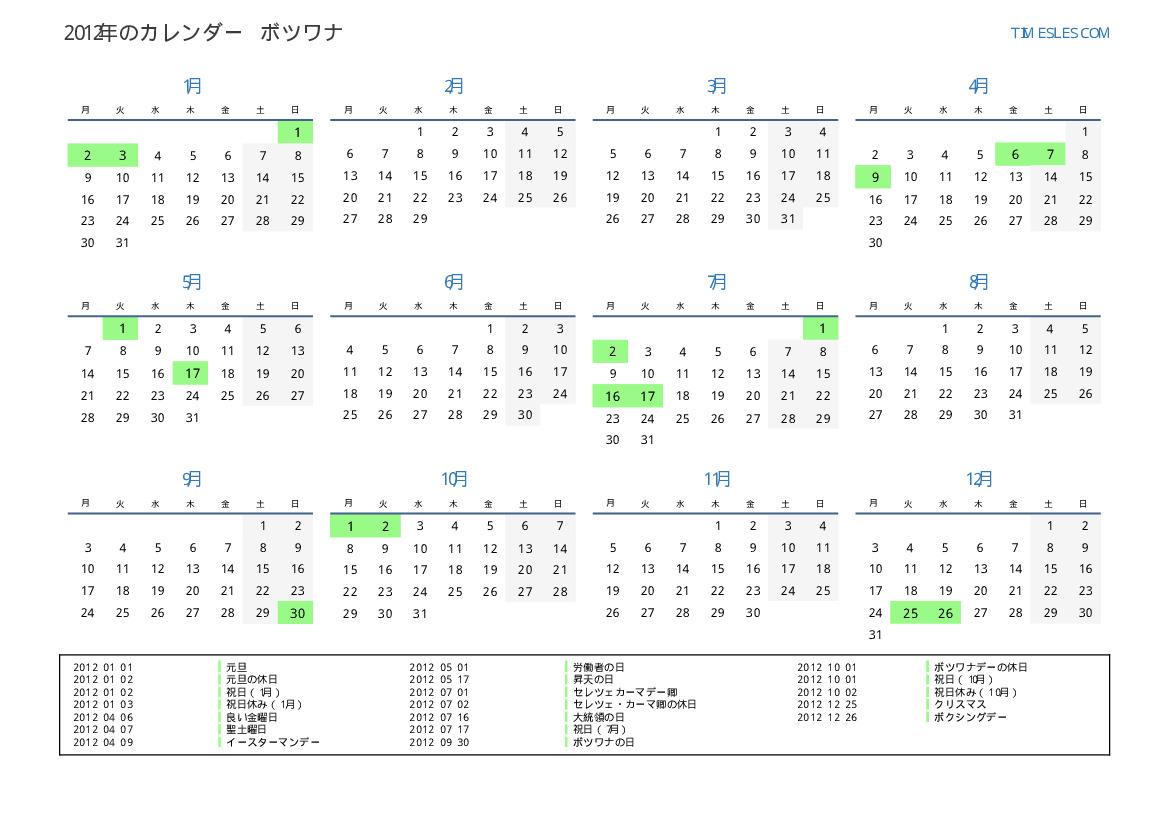 ボツワナ向けの2012年の休日と週末のカレンダー