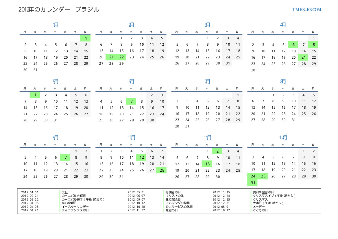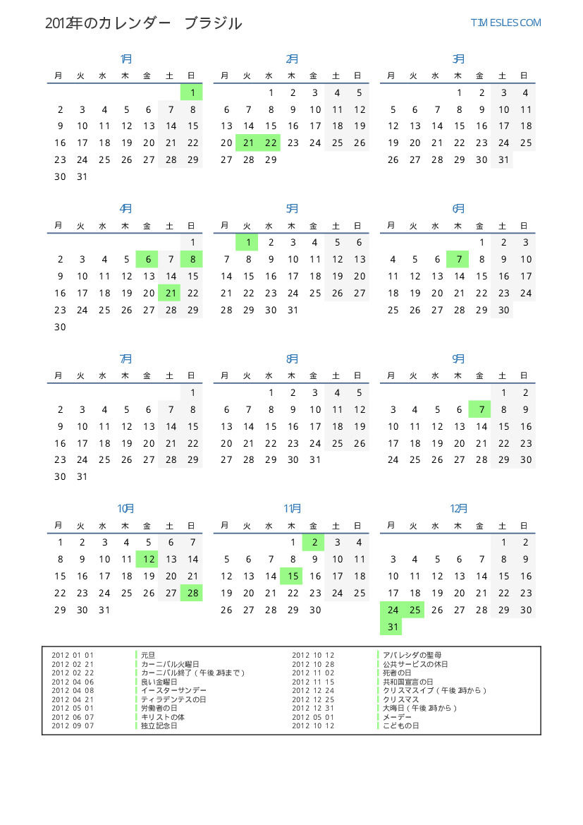ブラジル向け2012年の休日と週末を含むPDFカレンダーをダウンロードして印刷します