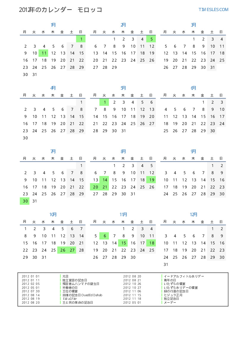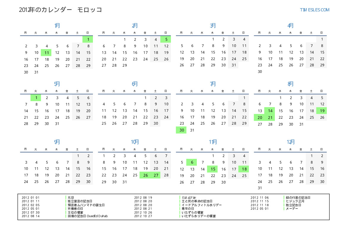 モロッコ向けの2012年の休日と週末のカレンダー