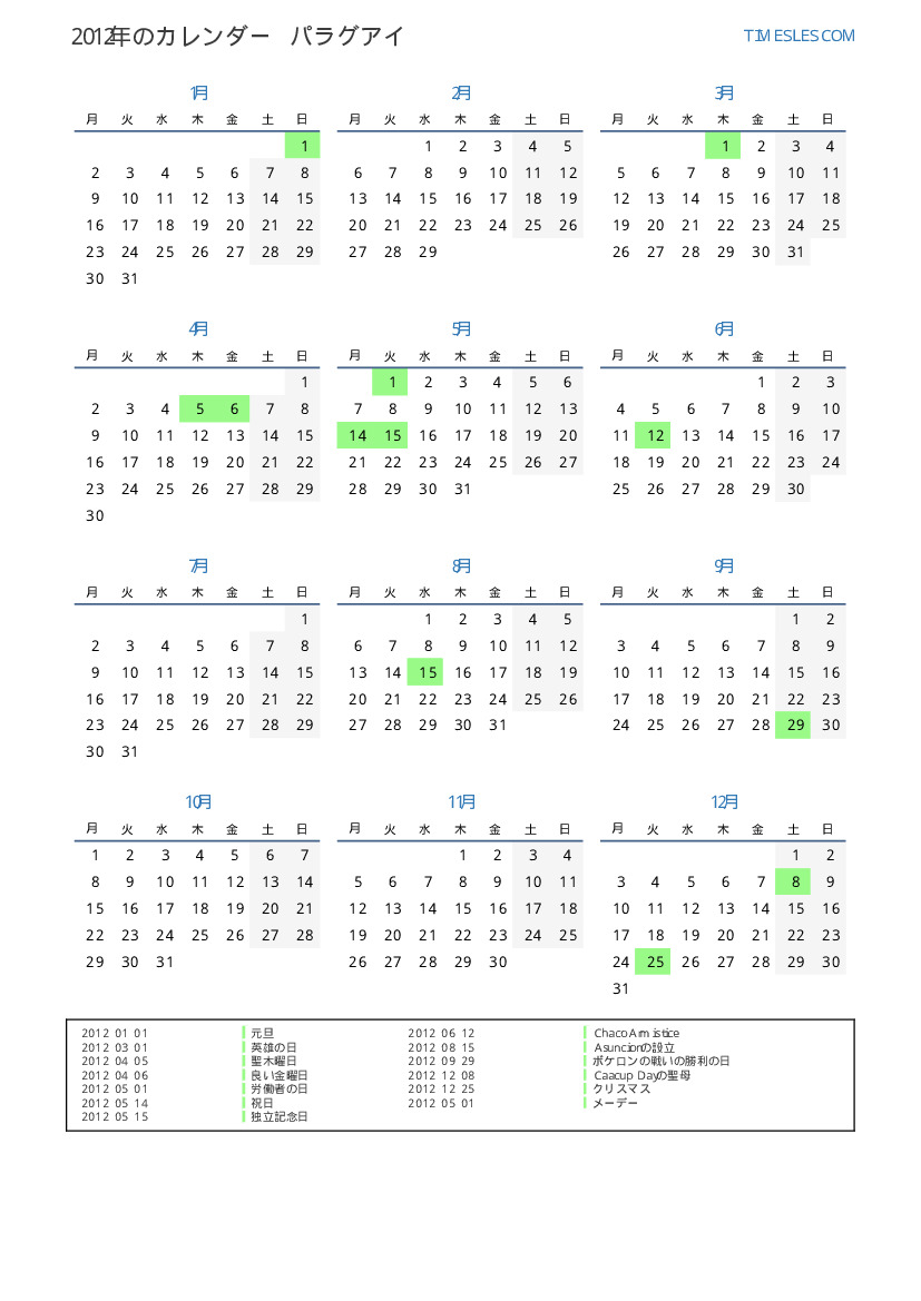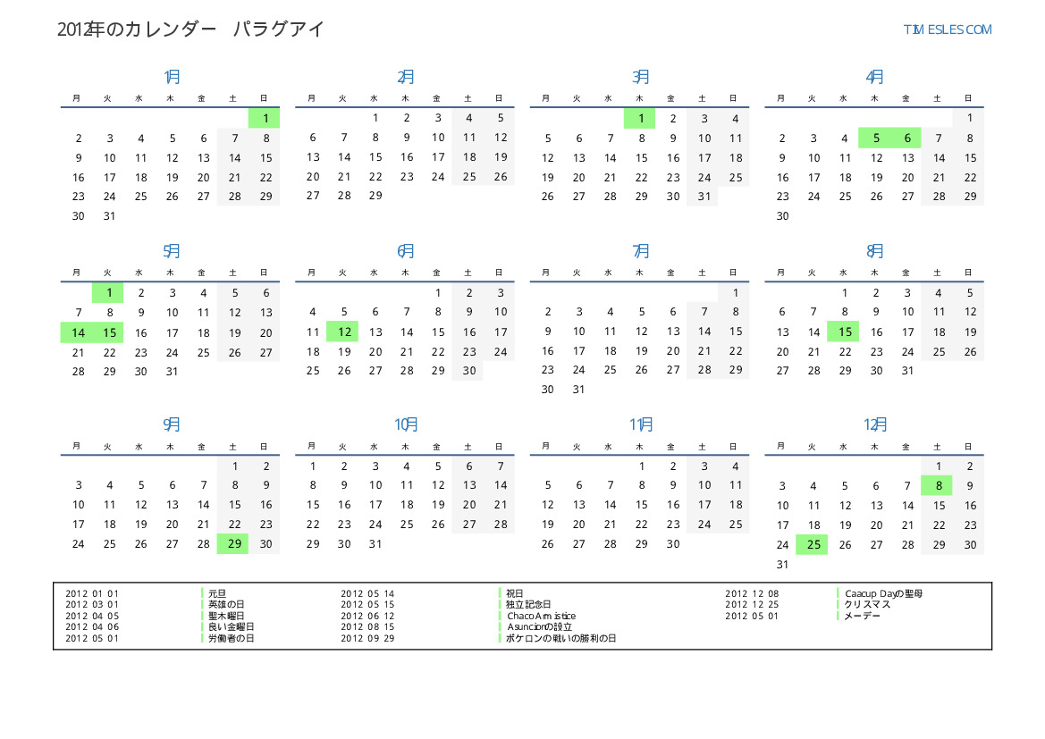 パラグアイ向けの2012年の休日と週末のカレンダー