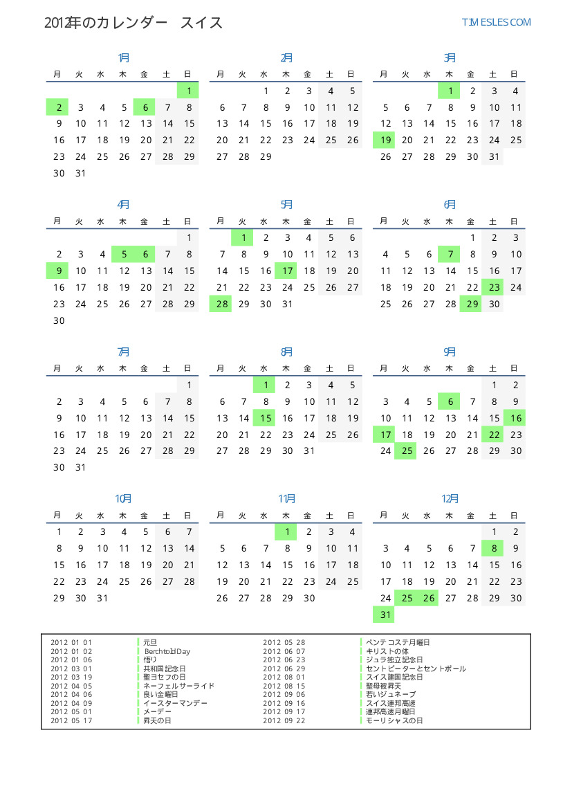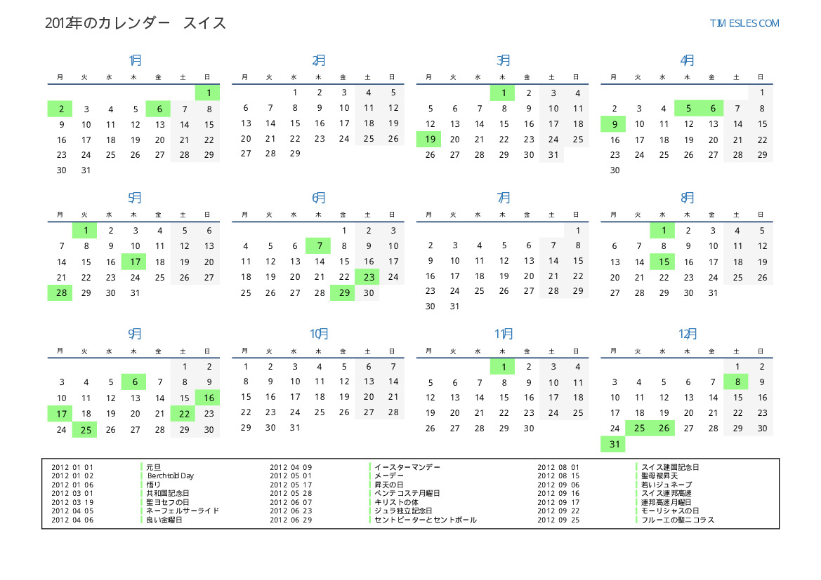 スイス向け2012年の休日と週末を含むPDFカレンダーをダウンロードして印刷します