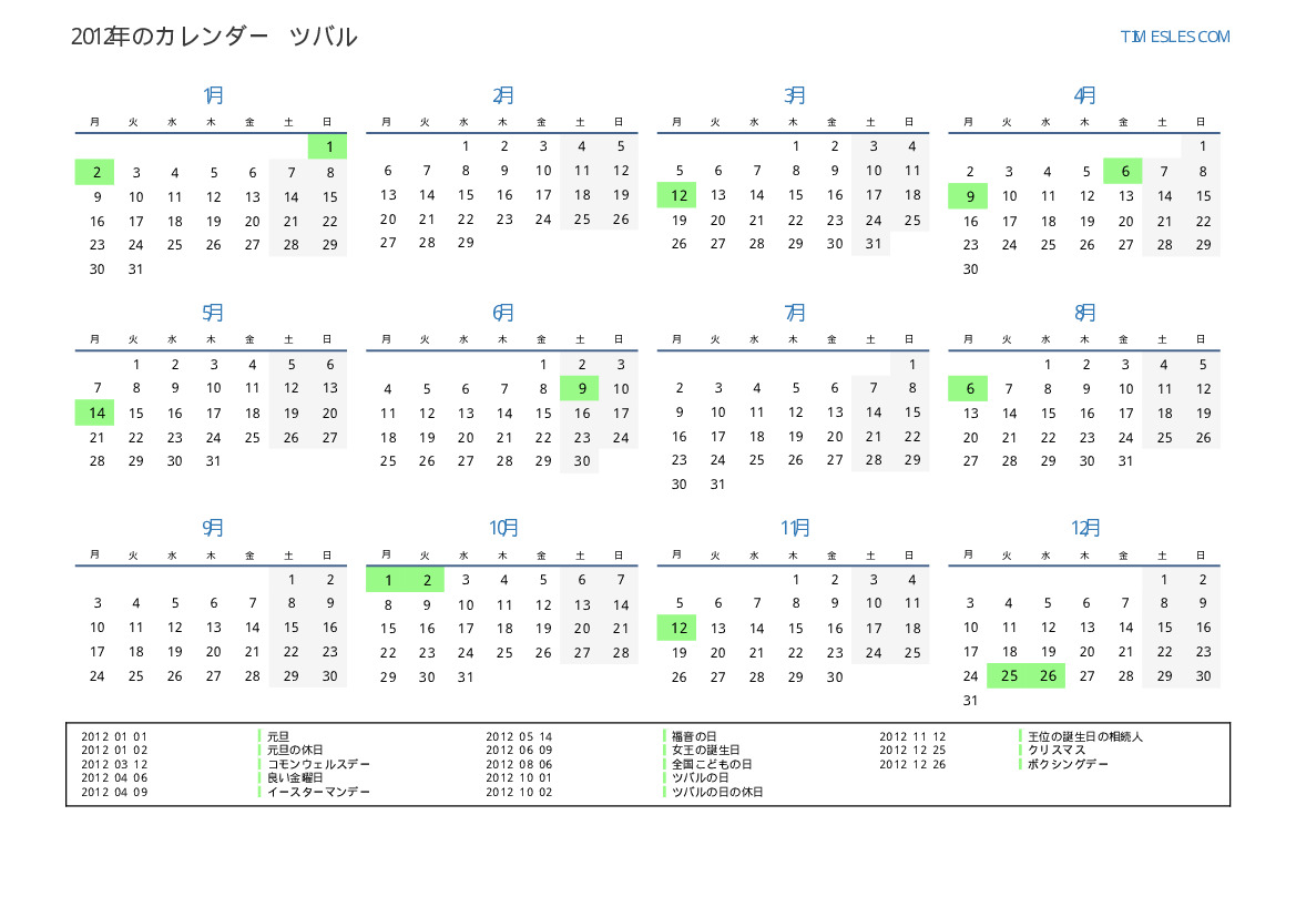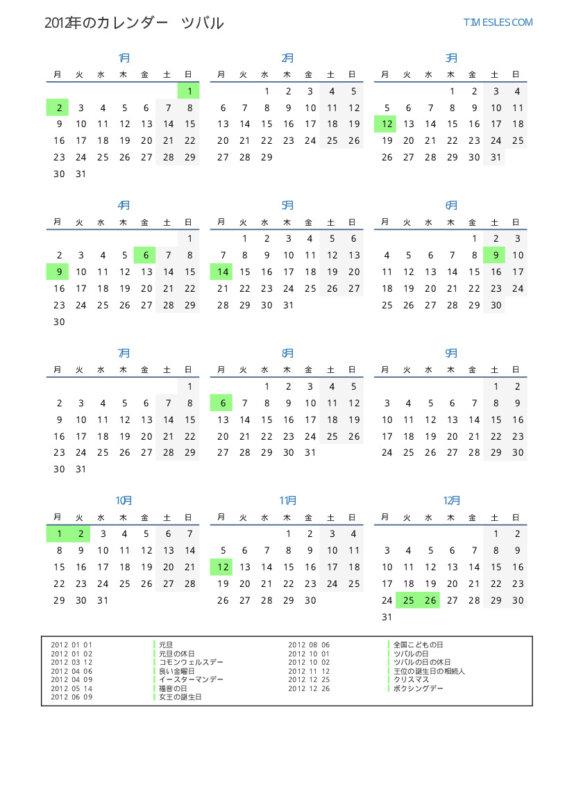 ツバル向け2012年の休日と週末を含むPDFカレンダーをダウンロードして印刷します