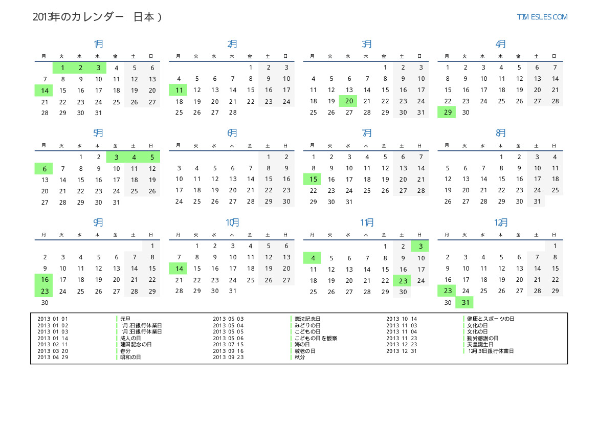 日本向けの2013年の休日と週末のカレンダー