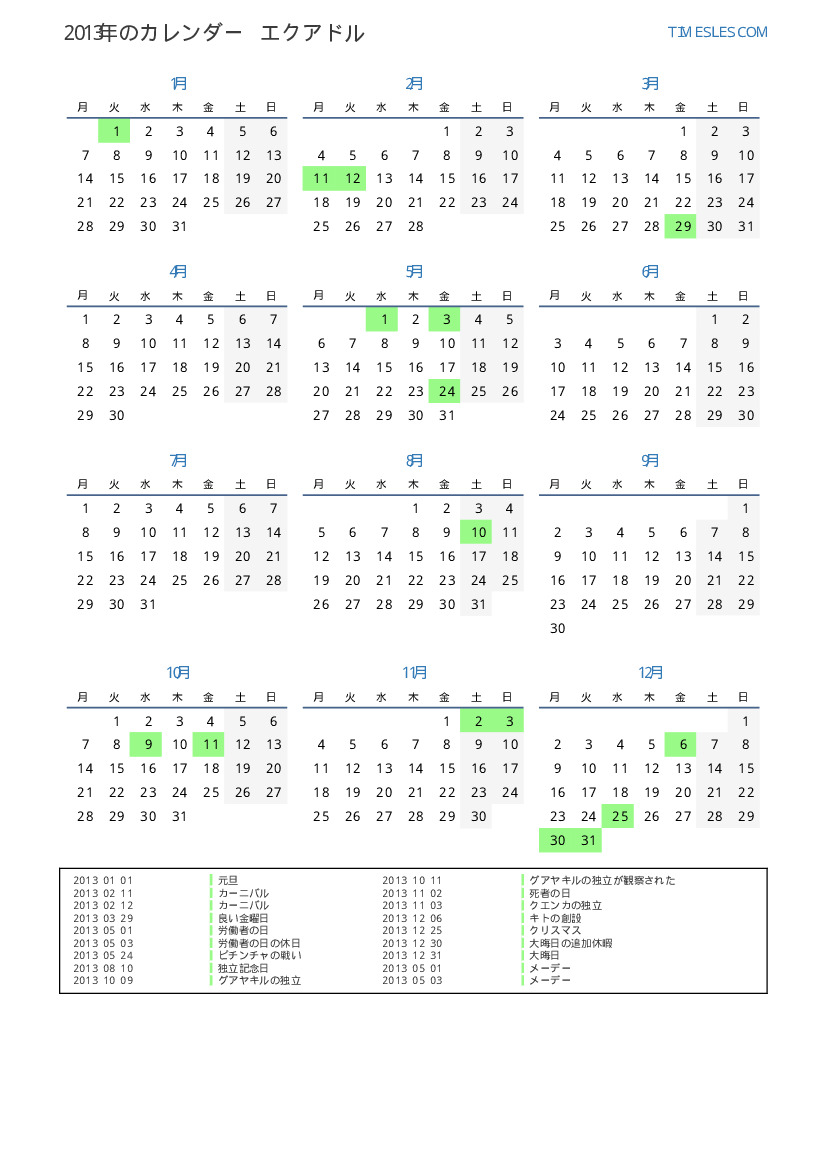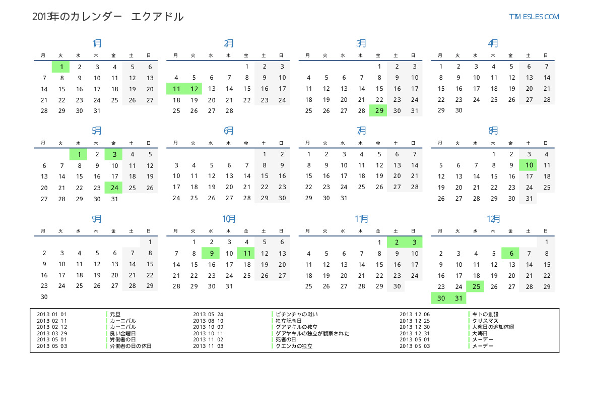 エクアドル向け2013年の休日と週末を含むPDFカレンダーをダウンロードして印刷します
