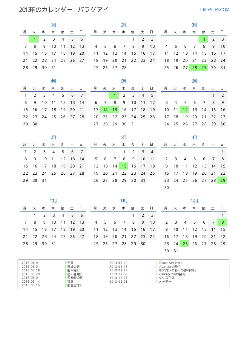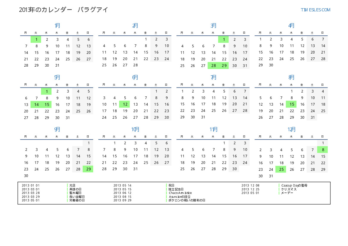 パラグアイ向けの2013年の休日と週末のカレンダー