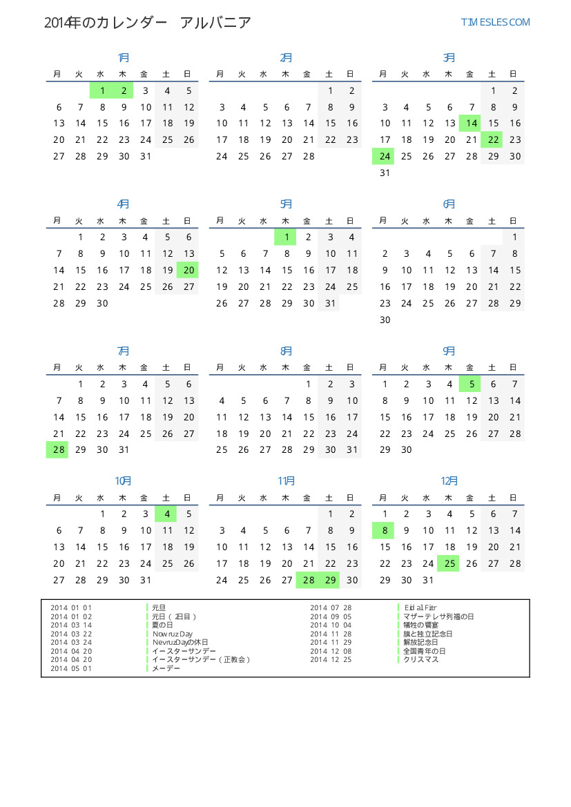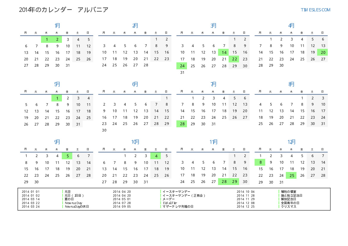 アルバニアの場合2014年カレンダー