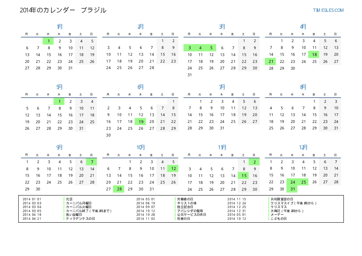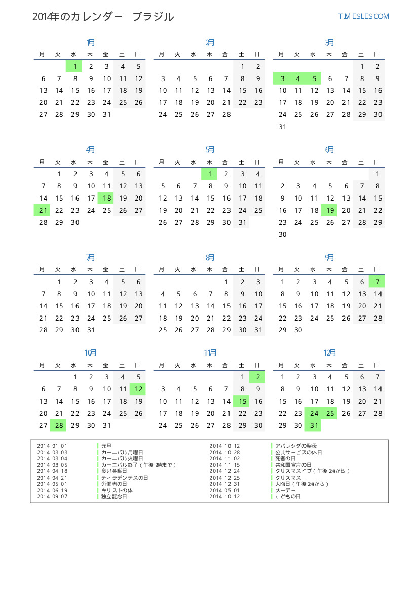 ブラジル向け2014年の休日と週末を含むPDFカレンダーをダウンロードして印刷します