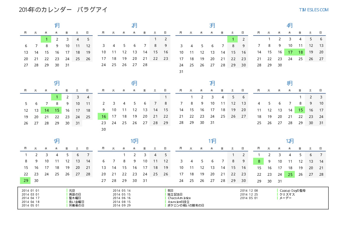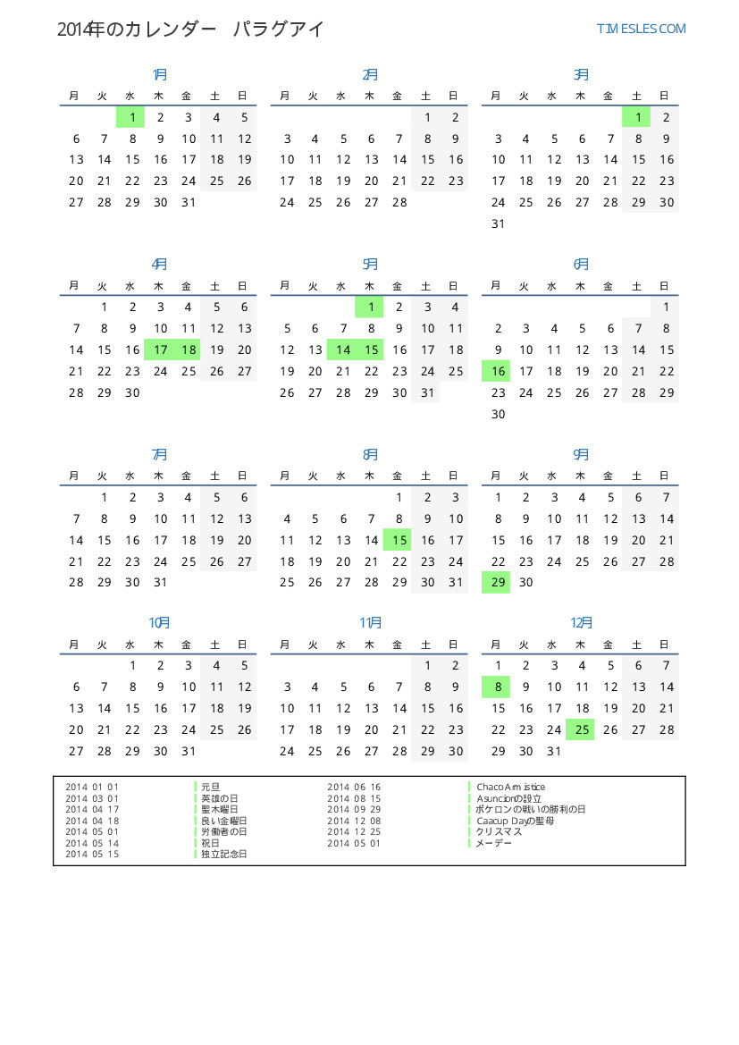 パラグアイ向けの2014年の休日と週末のカレンダー