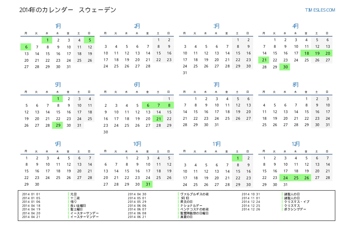 スウェーデン向けの2014年の休日と週末のカレンダー