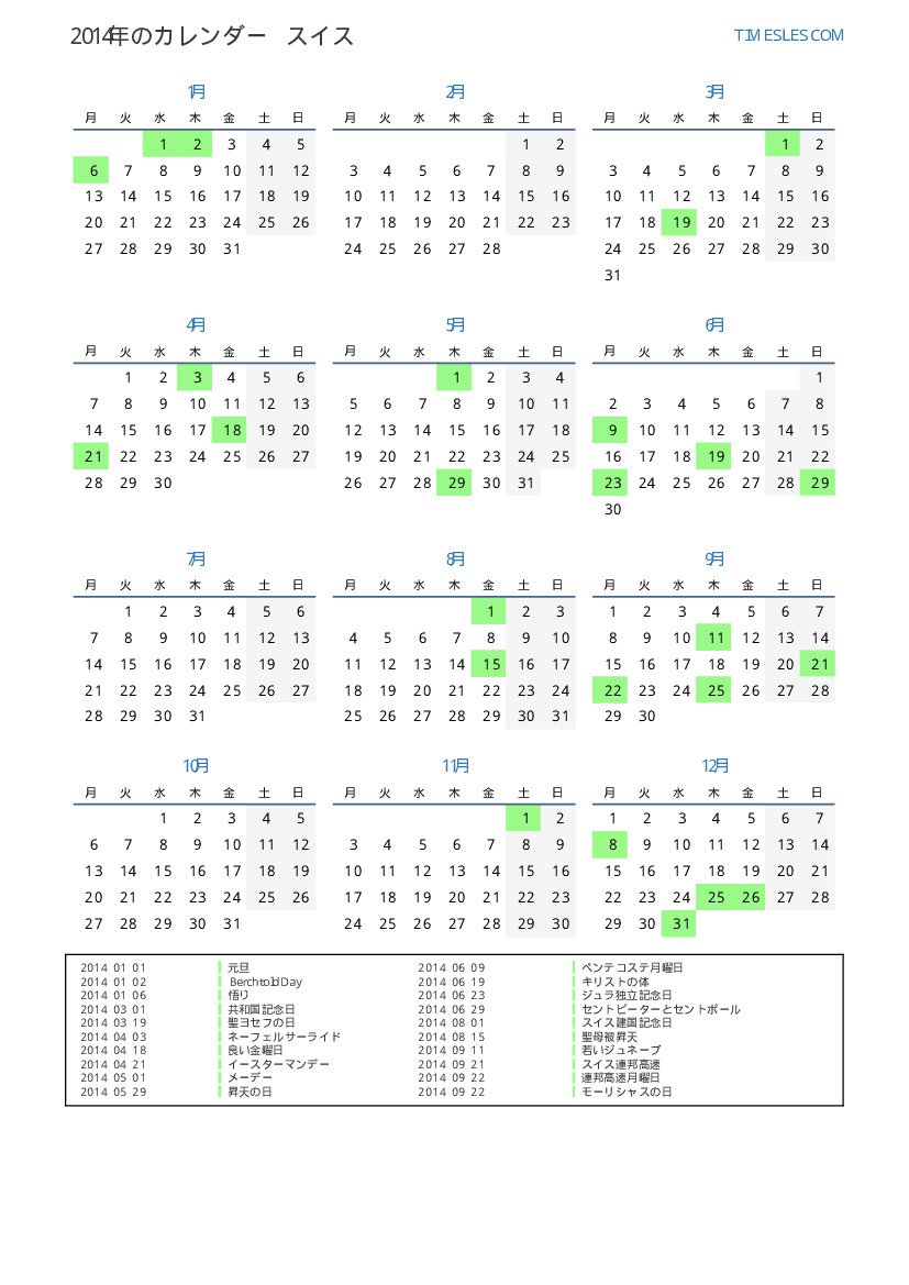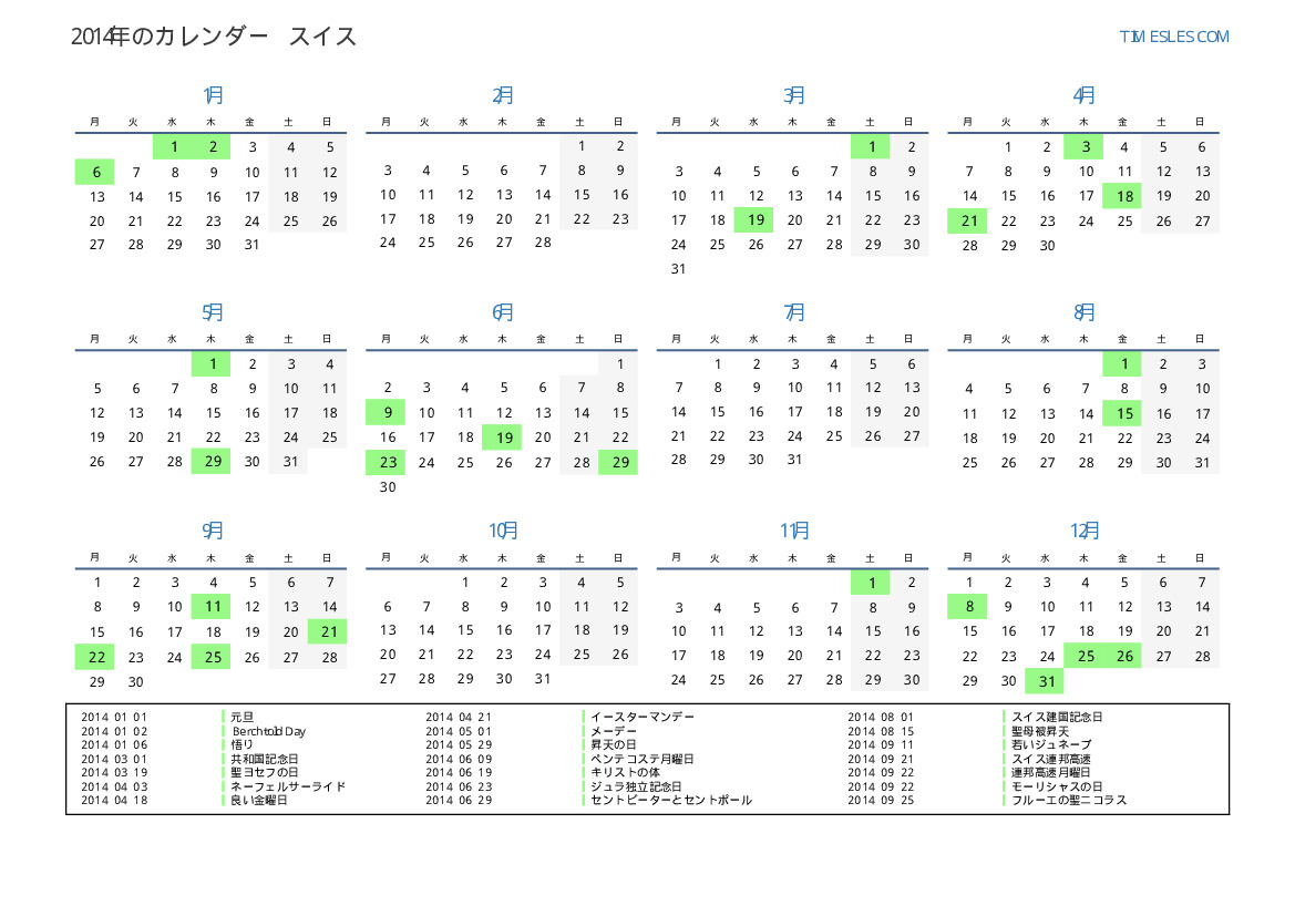 スイス向け2014年の休日と週末を含むPDFカレンダーをダウンロードして印刷します