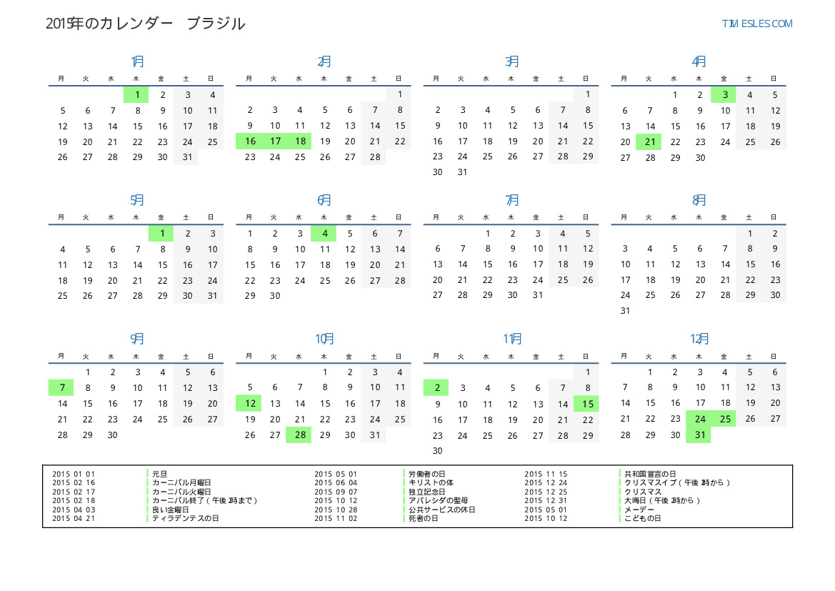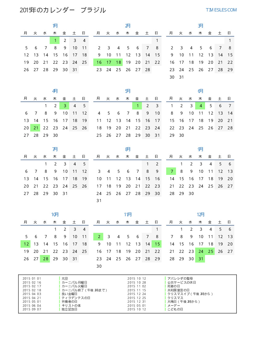 ブラジル向けの2015年の休日と週末のカレンダー