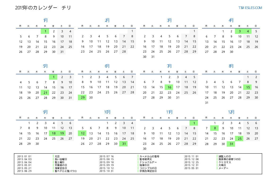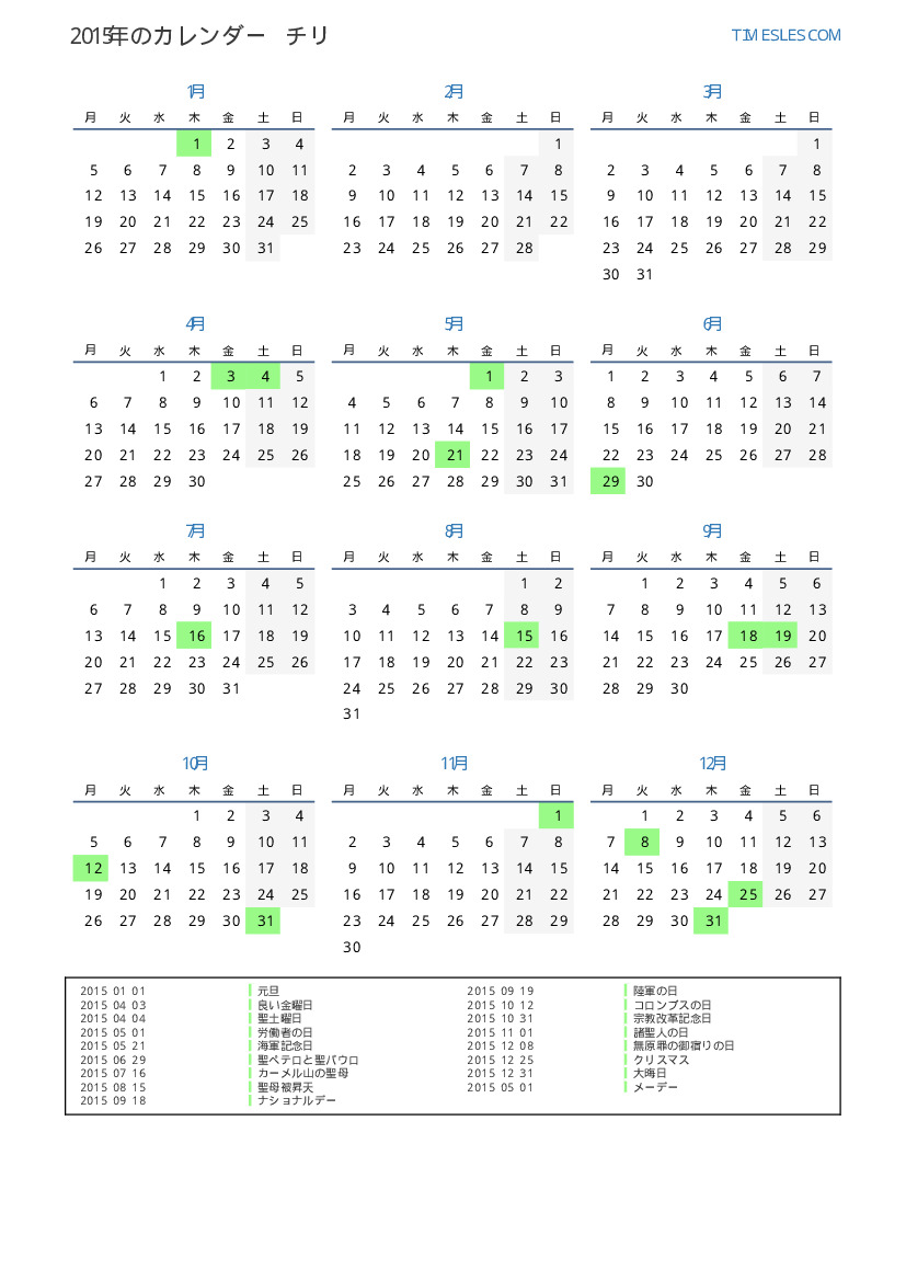 チリ向けの2015年の休日と週末のカレンダー
