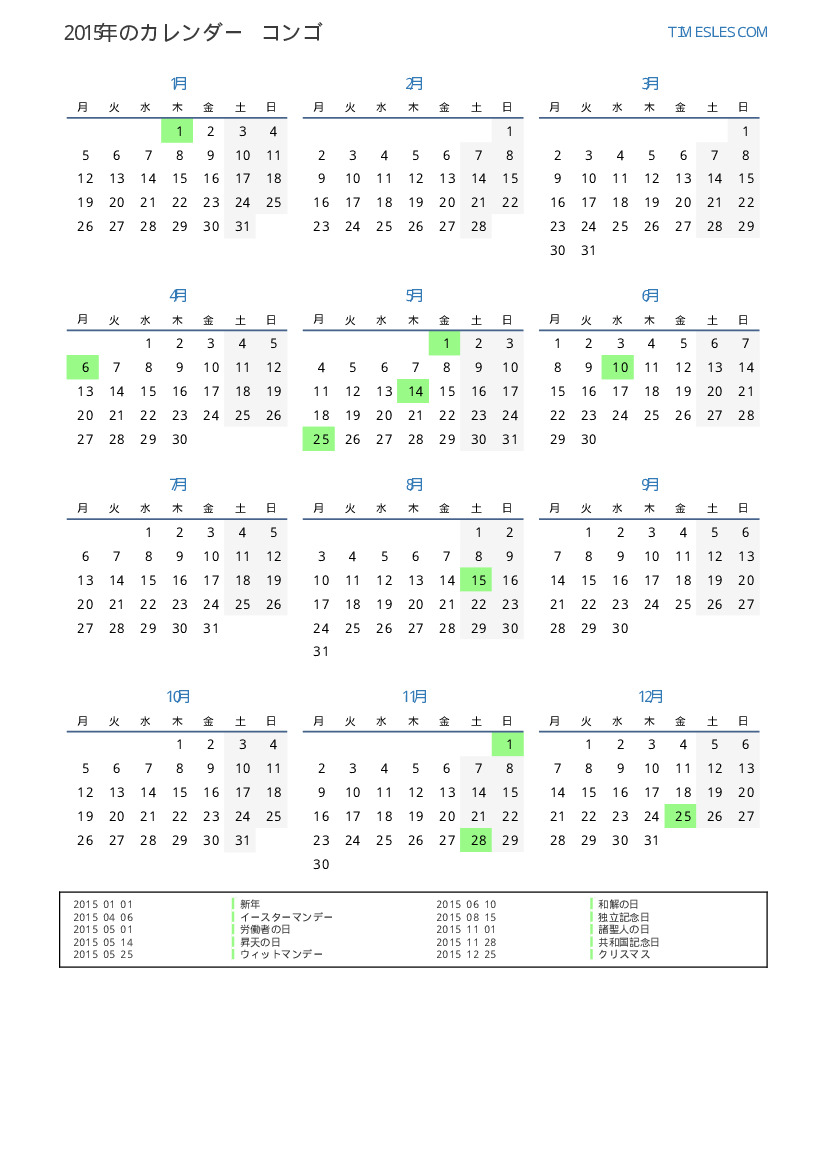 コンゴのために2015年の休日と週末を含むPDFカレンダーをダウンロードして印刷します