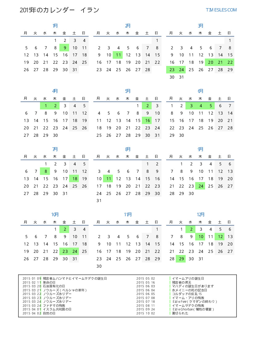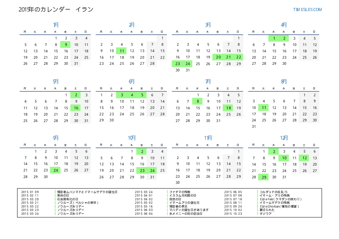 イランのために2015年の休日と週末を含むPDFカレンダーをダウンロードして印刷します