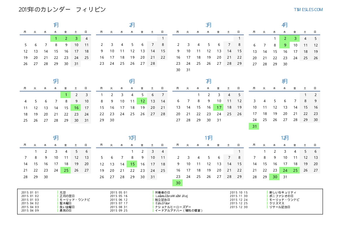 フィリピン向け2015年の休日と週末を含むPDFカレンダーをダウンロードして印刷します