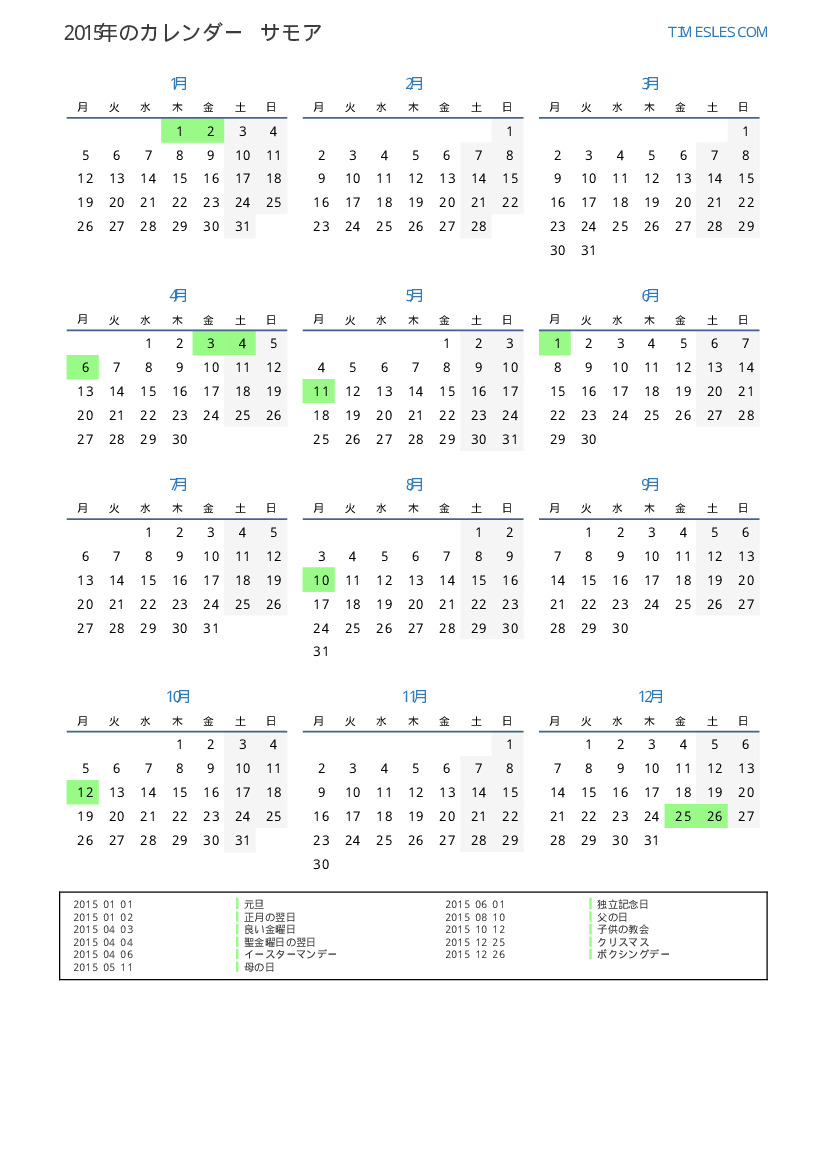サモアのために2015年の休日と週末を含むPDFカレンダーをダウンロードして印刷します