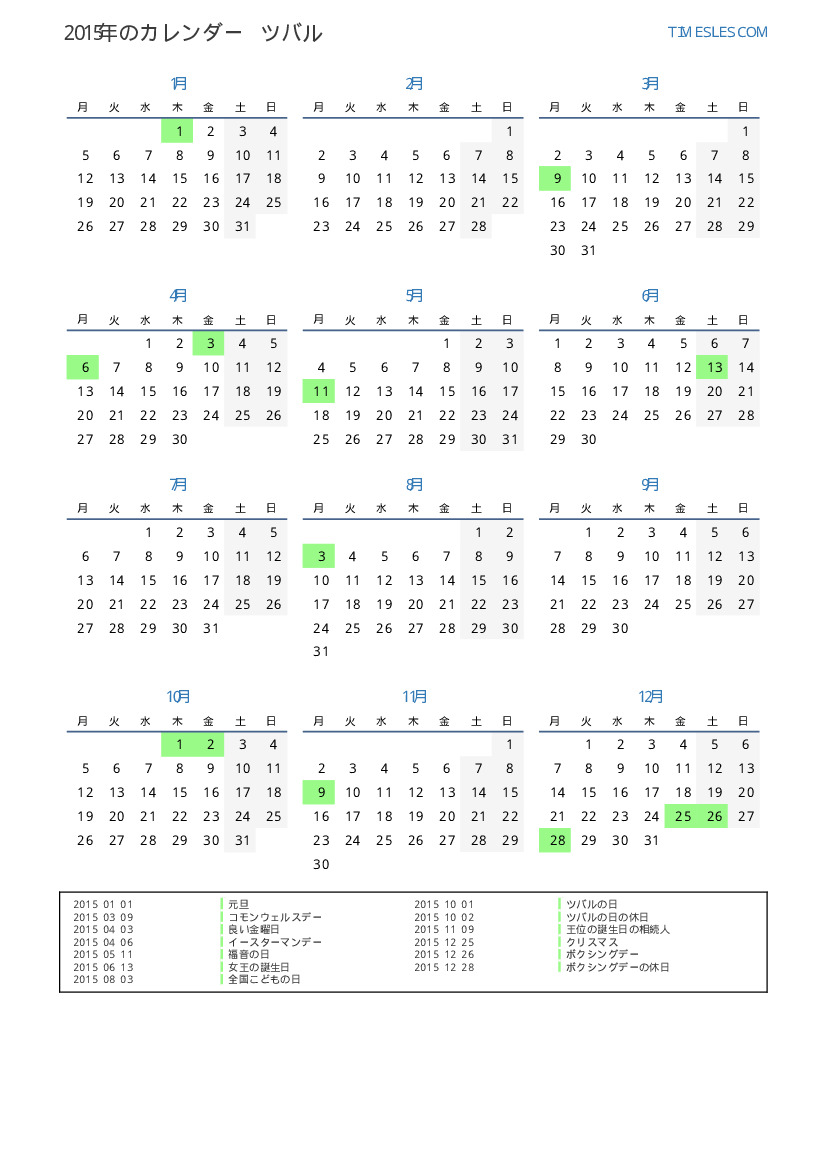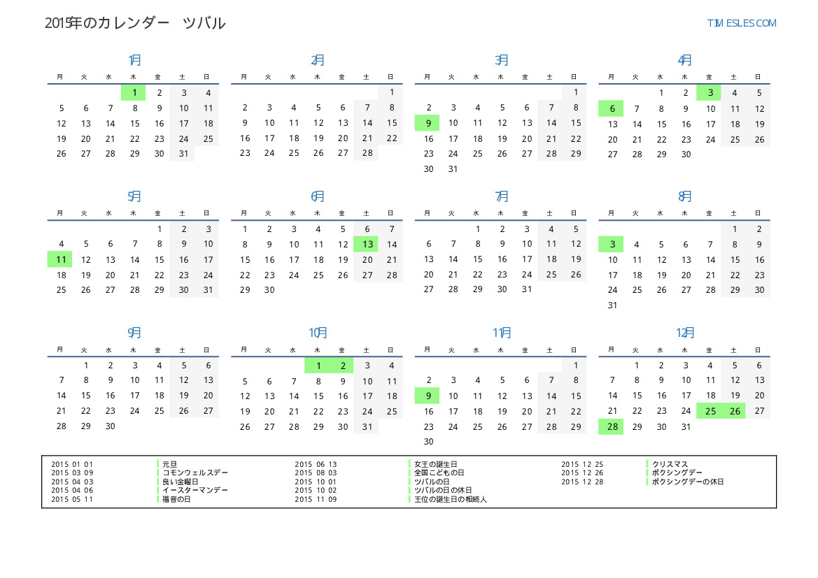 ツバル向けの2015年の休日と週末のカレンダー
