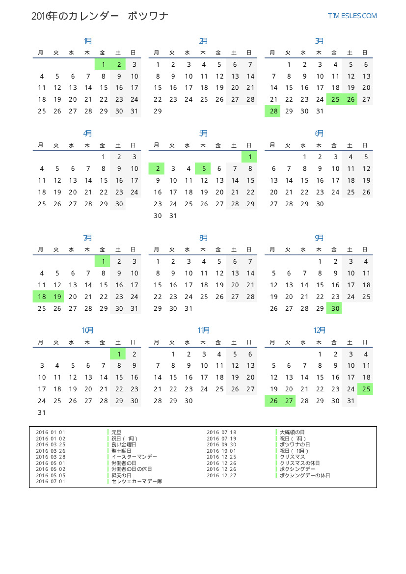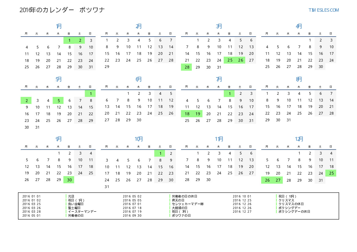 ボツワナ向けの2016年の休日と週末のカレンダー