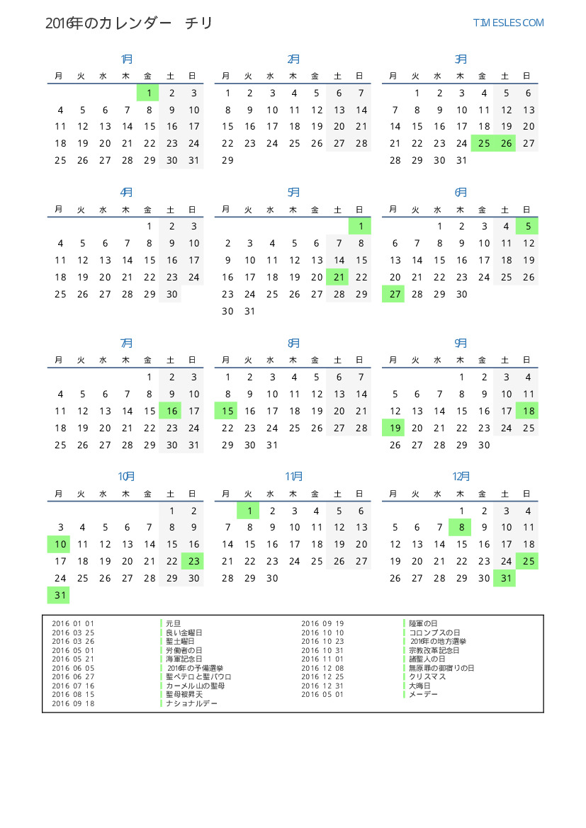 チリ向け2016年の休日と週末を含むPDFカレンダーをダウンロードして印刷します