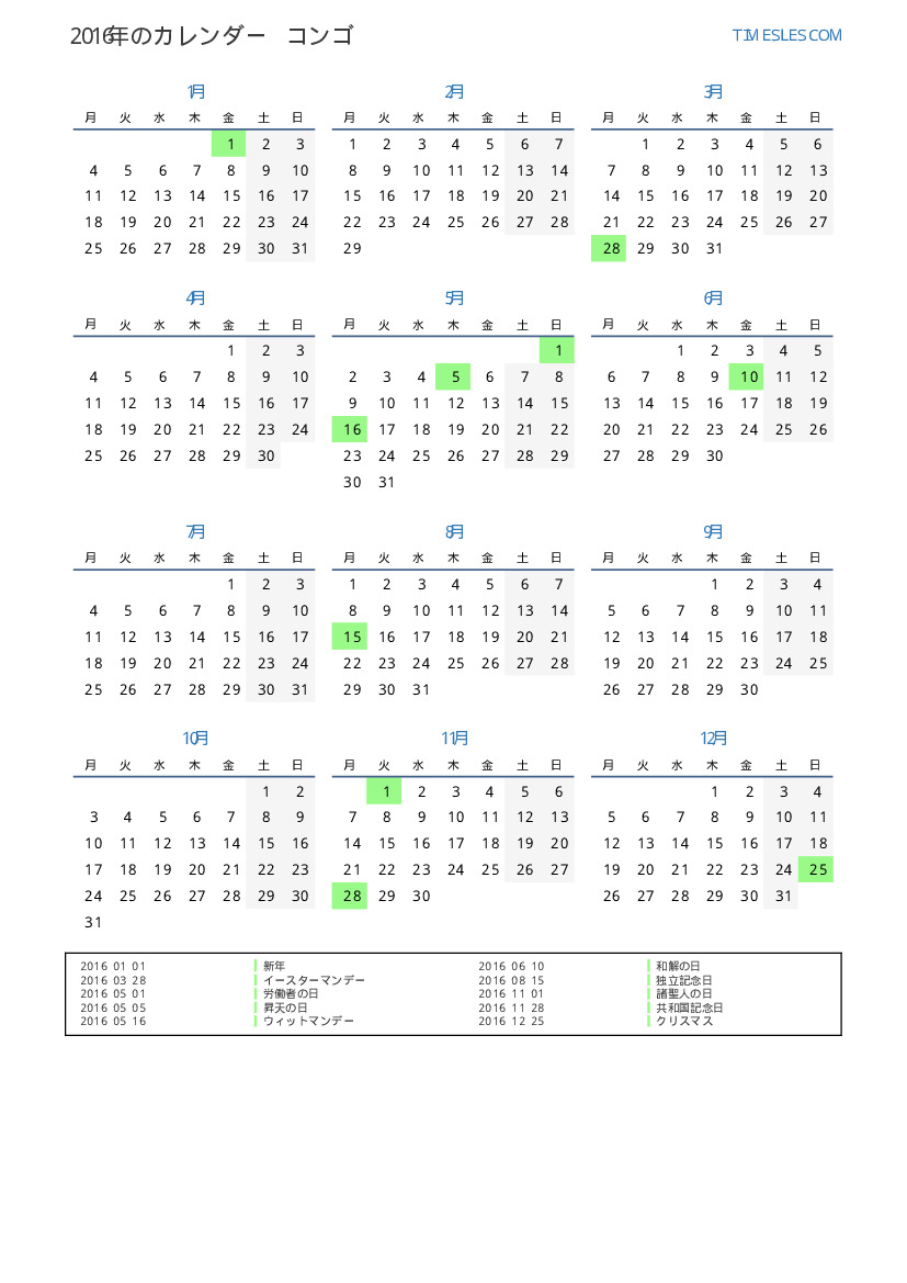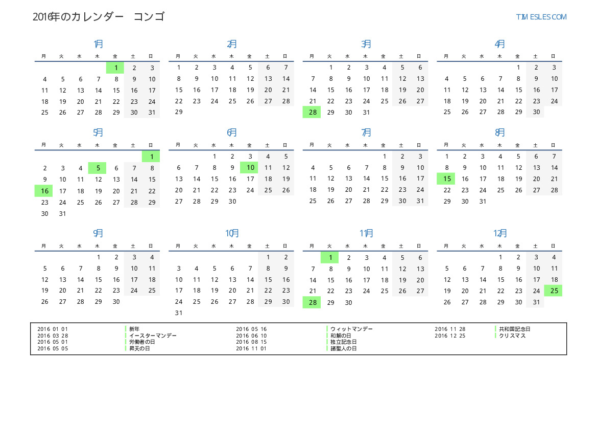 コンゴのために2016年の休日と週末を含むPDFカレンダーをダウンロードして印刷します