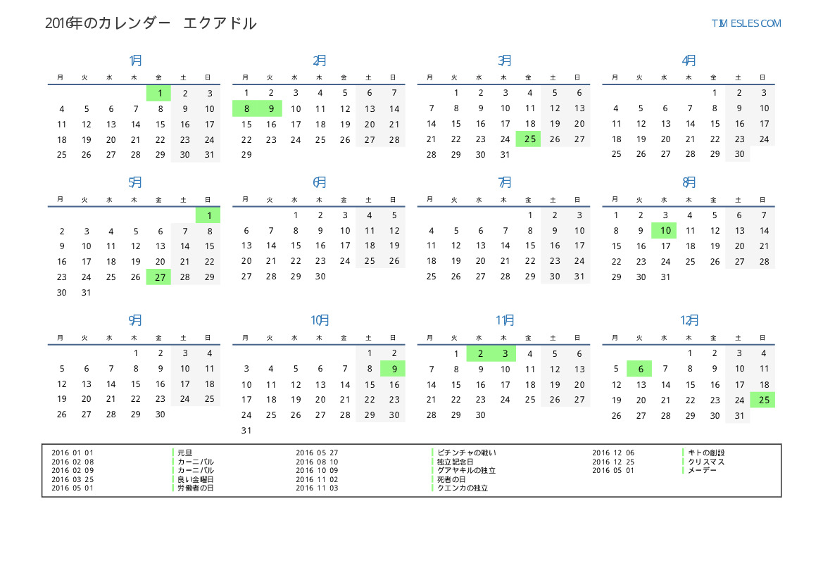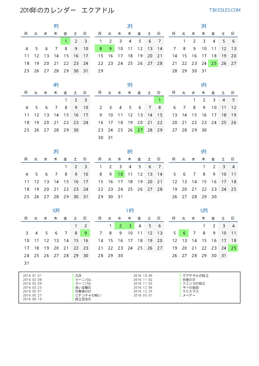 エクアドル向け2016年の休日と週末を含むPDFカレンダーをダウンロードして印刷します