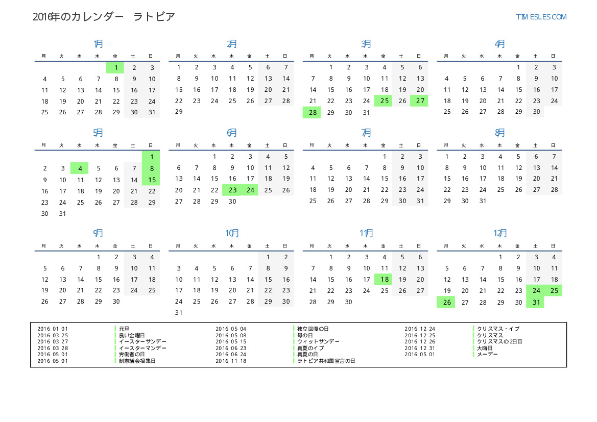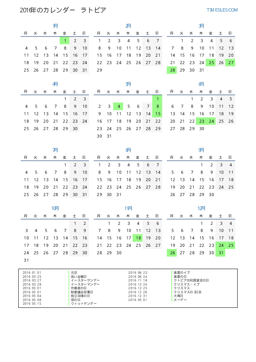 ラトビア向け2016年カレンダー