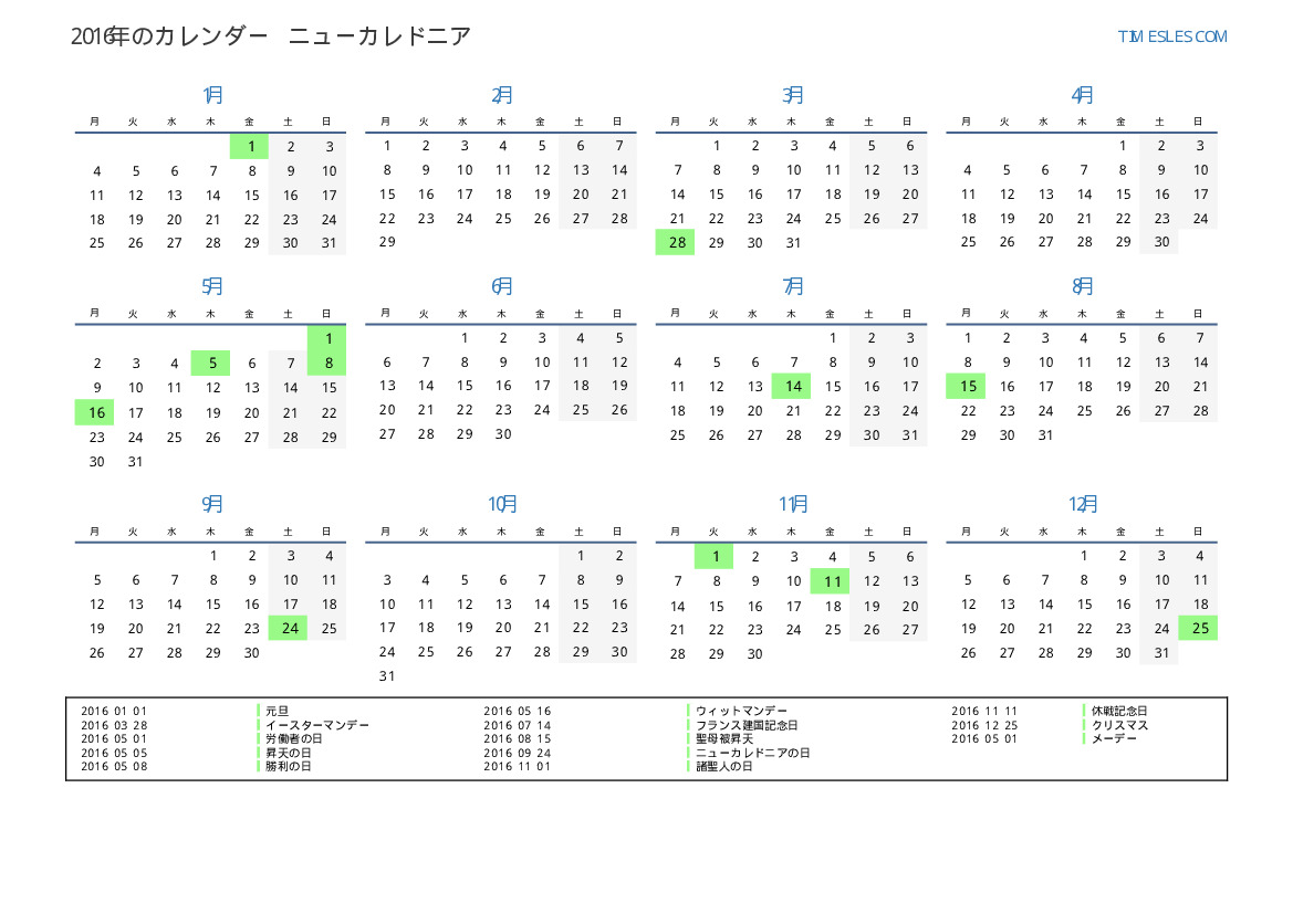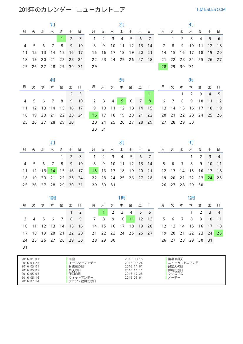 ニューカレドニア向けの2016年の休日と週末のカレンダー