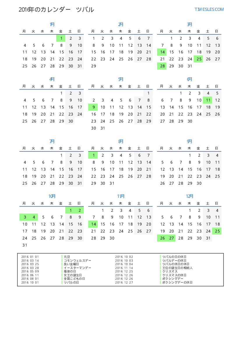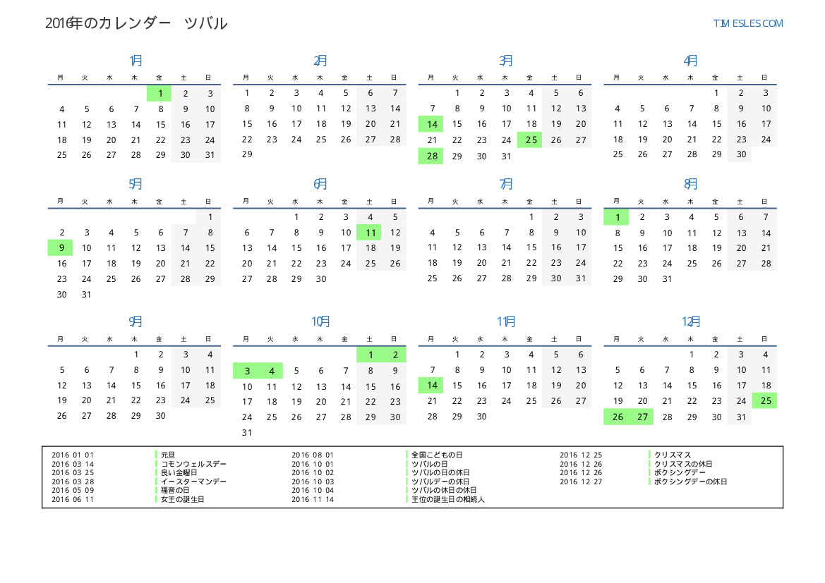 ツバル向けの2016年の休日と週末のカレンダー