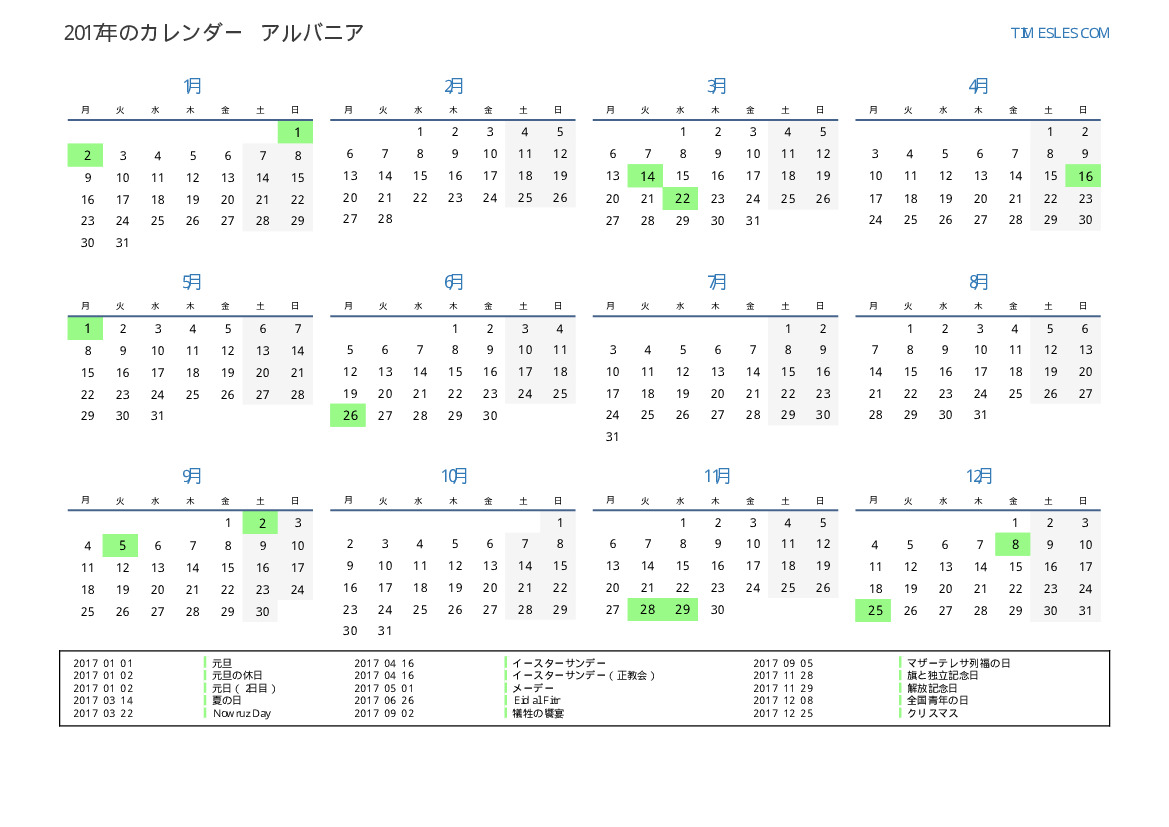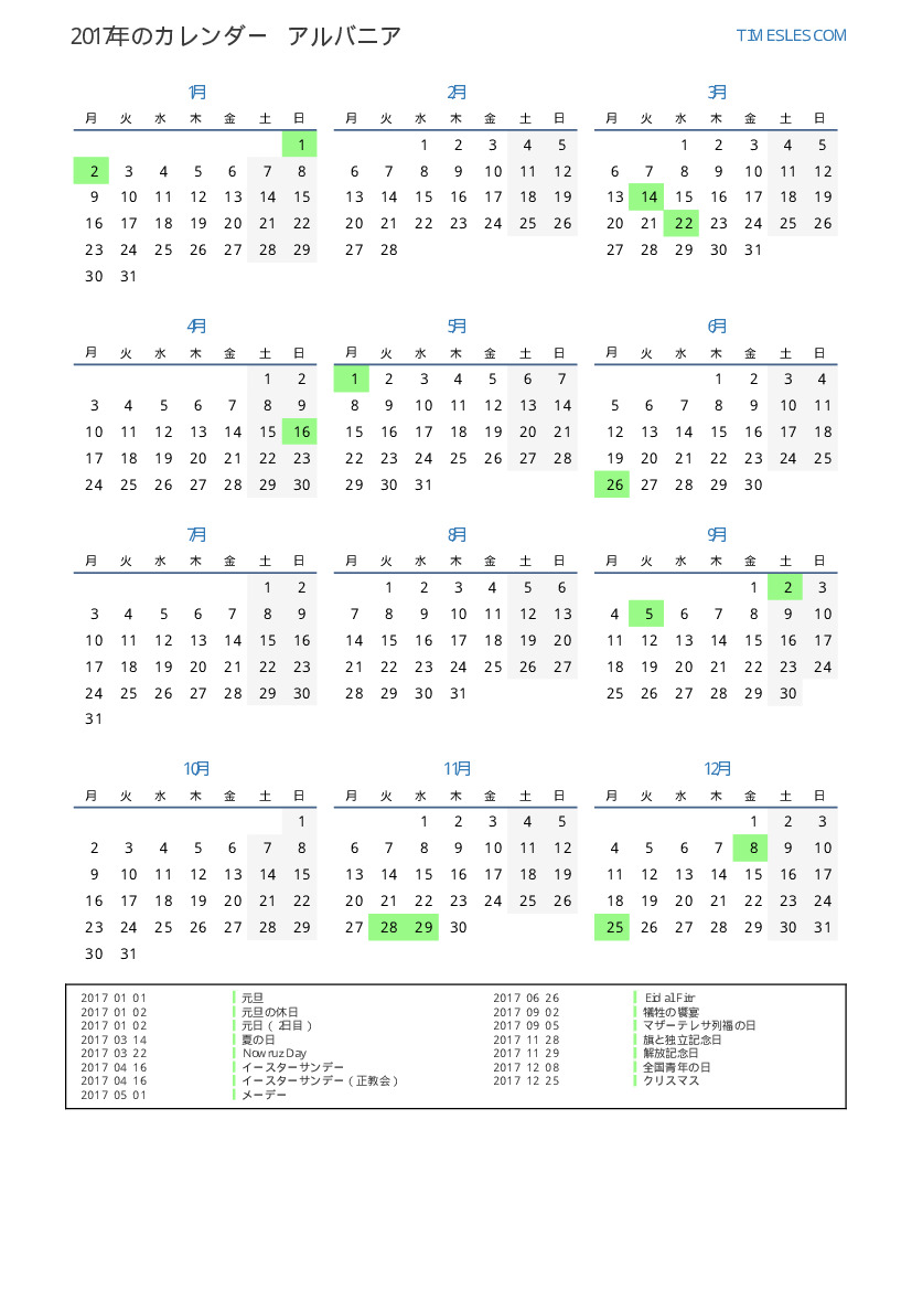 アルバニアの場合の2017年の休日と週末のカレンダー