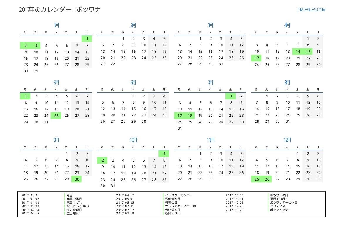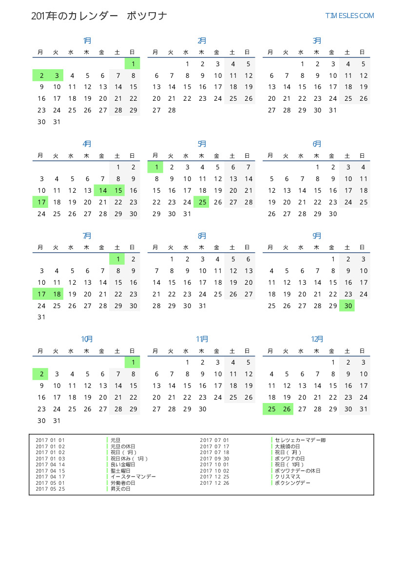 ボツワナ向けの2017年の休日と週末のカレンダー